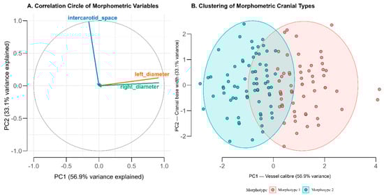 Principal Component and Cluster Analysis of Carotid Morphometric Parameters (A) Correlation circle showing variable loadings on the first two principal components derived from standardized measurements of the left and right internal carotid artery (ICA) diameters and intercarotid distance. The first component (PC1; 56.9% variance) reflects overall vessel caliber, while the second (PC2; 33.1%) represents cranial base width. (B) Two-cluster solution of individual scores in the PCA space, corresponding to distinct morphometric cranial types. Morphotype 1 (coral) is characterized by larger ICA diameters and narrower intercarotid spacing, whereas Morphotype 2 (cyan) shows smaller diameters and wider spacing. Ellipses indicate 95% confidence regions for each cluster.