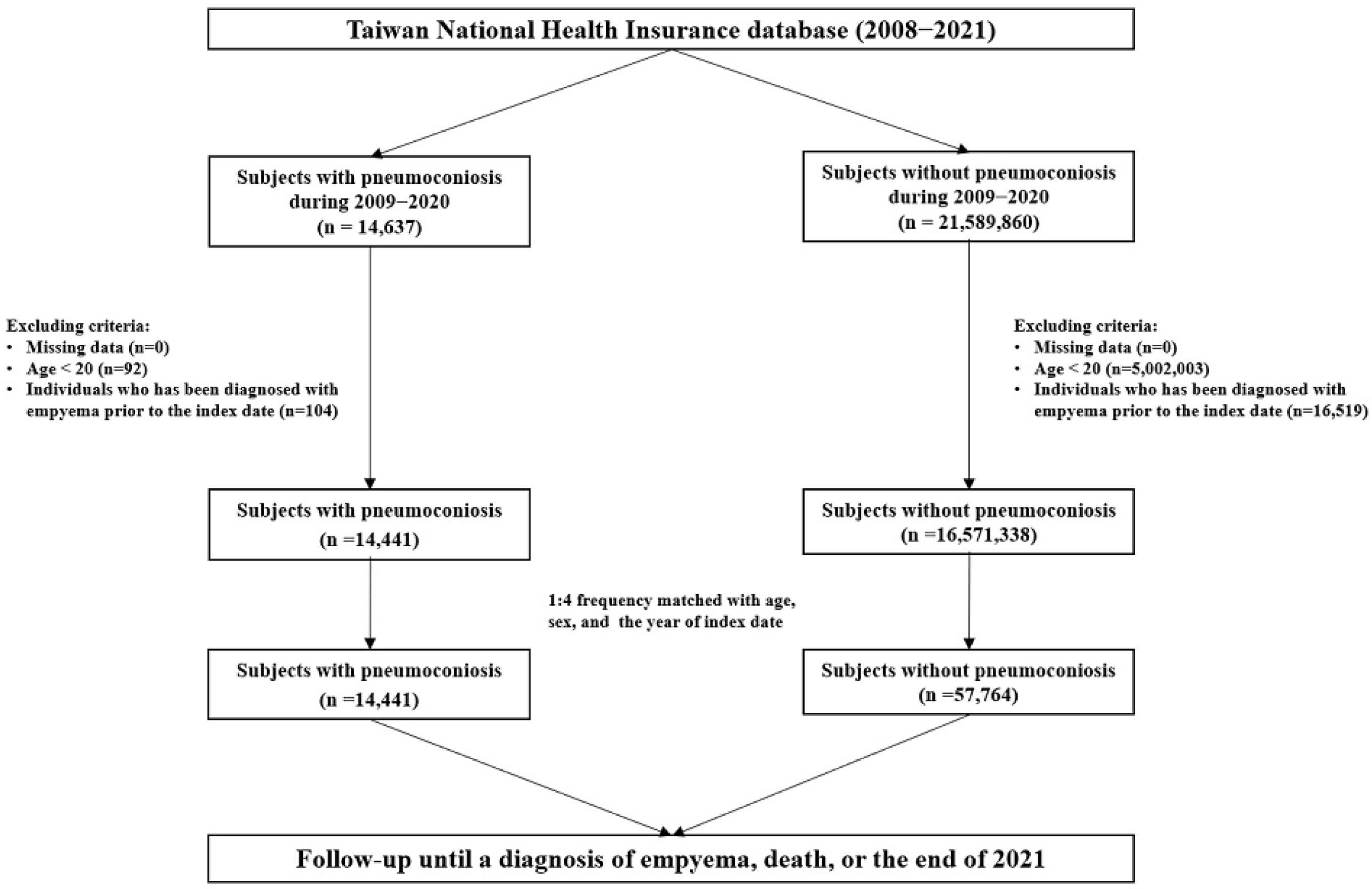 Soh, K.-S.; Lin, C.-L.; Lee, W.-M.; Cho, D.-Y. Association Between Pneumoconiosis and Pleural Empyema: A Retrospective Cohort Study. Diagnostics 2025, 15, 3075. https://doi.org/10.3390/diagnostics15233075