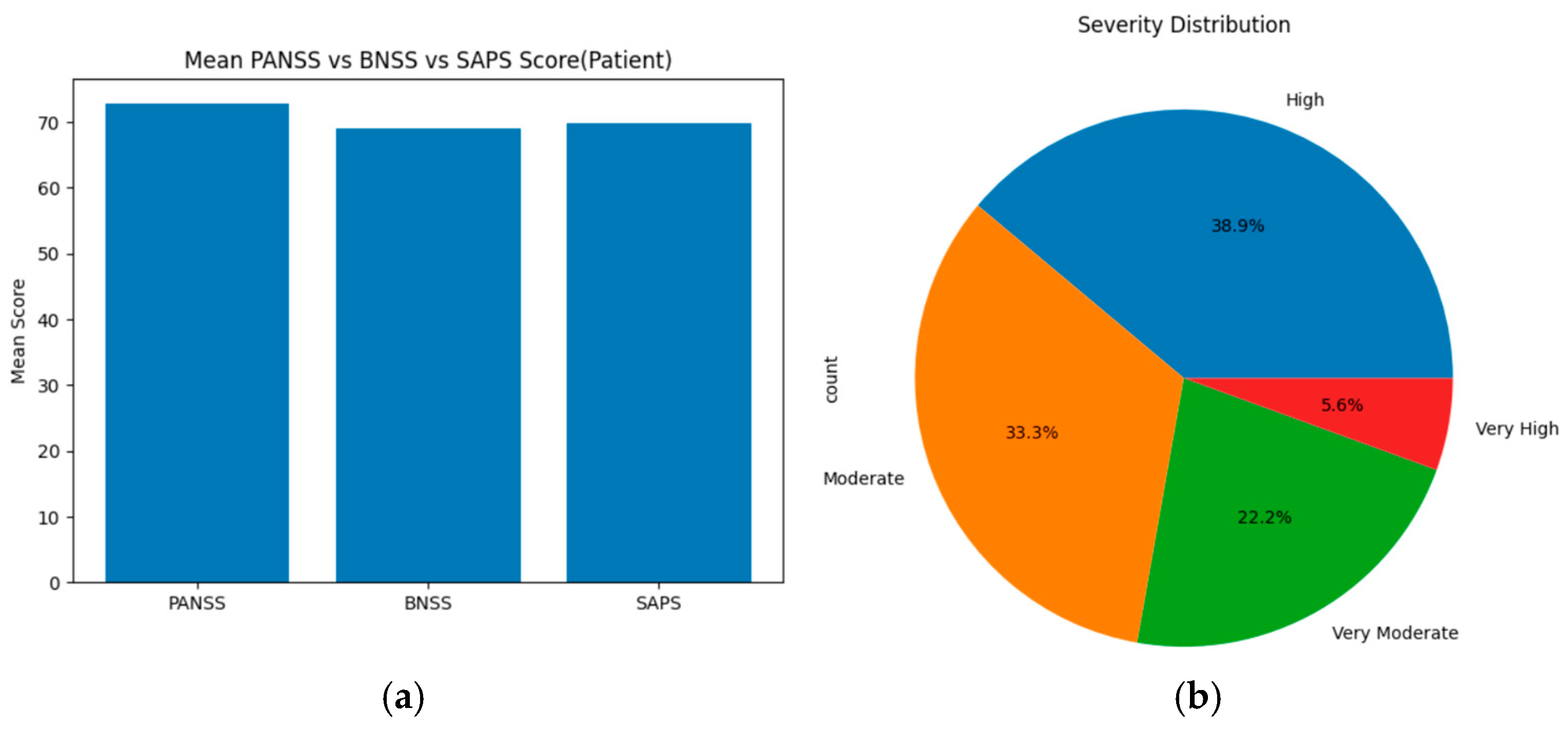 Figure 7a displays the mean score across PANSS, SAPS, and BNSS assessment tools of the schizophrenia patients’ group, and (b) represents the severity distribution across three assessment tools of the schizophrenia patient group.