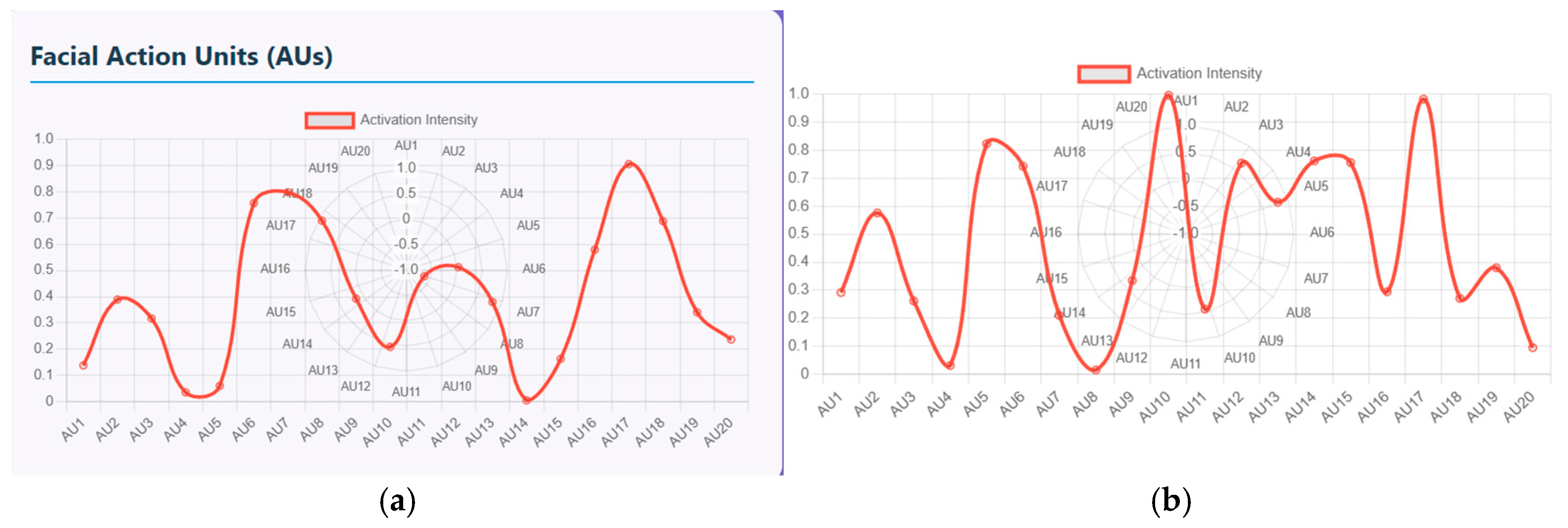 Figure 10a shows the plot of measured intensity for each AU of schizophrenia patients. The AUs with high intensity that range from 0.8 to 0.9 represent muscle groups that are strongly activated, indicating either chin raise and lip compression, disgust or frustration emotion (AU17-19), and eye tightening and stress related expressions at AU7/8. Similarly, lower intensity that ranges from 0 to 0.1 shows symptoms like minimal activation with no anger, little brow lowering and cheek puffing. Similarly, (b) shows the plot of measured intensity for each AU of healthy controls. In this figure, AU10 and AU17/18/20 display near-maximum intensity of about 1 that represents strong facial expressions. AU5 and AU14 display high activation, ranging from 0.75 and 0.85, that represents eye widening and cheek movement. Here, the pattern is non-linear with multiple peaks indicating mixed emotional expressions.