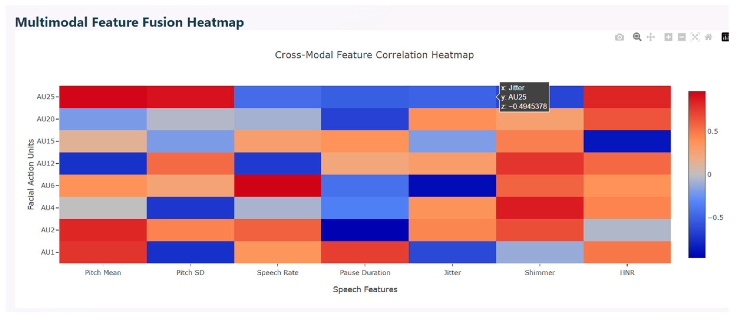Multimodal correlation heatmap is used to find the relationship between facial action units (FAU) and speech features. This describes the interaction between facial expressions and vocal characteristics. The red color in the figure represents positive correlation that show the features’ increase together, the blue color indicates negative correlation that show the features’ movement in opposite directions, and light shades indicate weak or near zero correlation. Various AUs show strong positive correlation with speech features. AU25, AU2, AU12, and AU1 correlate with shimmer and harmonic-to-noise ratio which represent high emotional intensity. AU6, AU15, and AU25 correlate with jitter, indicating that during calm vocal states, these facial expressions exhibit strong emotions and stabilized pitch. Mixed correlation is observed with positive correlation between AU25 and AU2 and negative correlation between AU6 and AU15, indicating that upper facial movements correlate with higher pitch. Similarly, lower face tension correlates to stable pitch.