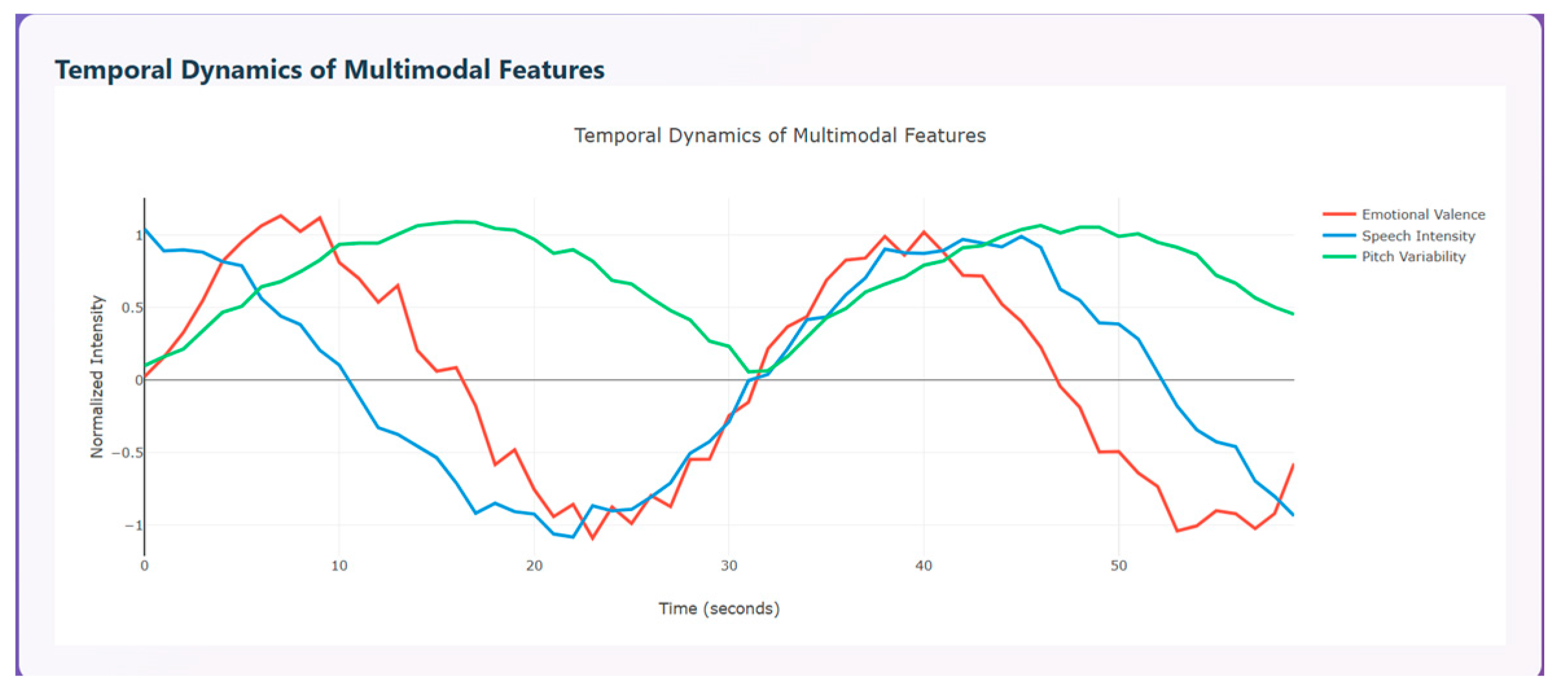 Temporal dynamics of multimodal features are used to compare the modalities over time (0–55 s). The three curves shown indicate how emotional change, represented in red, speech intensity, represented in blue, and pitch variability, represented in green, change with respect to time. All three modalities show clear ups and downs that indicate temporal coherence between emotions and the vocal system. The red curve initially has a peak around 5–10 s indicating pleasant emotion, a strong drop around 20–25 s indicating unpleasant emotion, and a subsequent rise again around 35–45 s and a drop around 50 s, displaying that a person shows a transition of emotions over time. The blue curve initially starts with high vocal energy, then drops steadily around 20–25 s, then rises around 35–40 s, and drops again around 45 s. This variation denotes that speech intensity is high during positive emotions and lowest during negative phases. The green curve initially rises sharply, then maintains stable, high changes around 10–35 s and declines at the end.