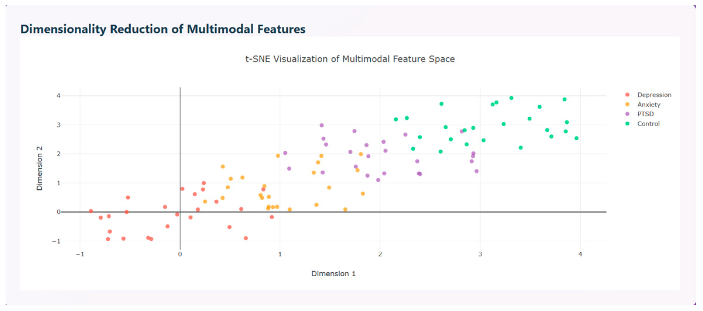 Multimodal features are visualized using t-SNE visualization that distinguishes the disorders based on the features extracted as shown in