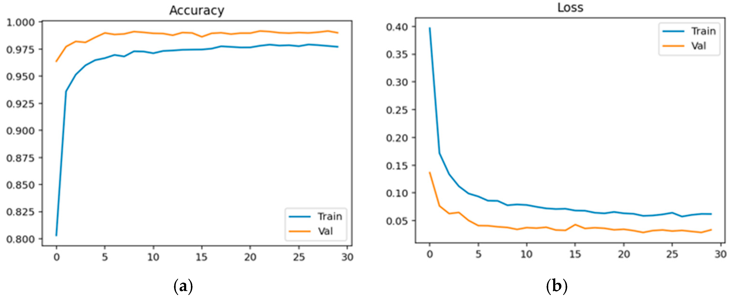 Figure 17a displays the training and validation accuracy for healthy controls, and (b) displays the training and validation loss for healthy controls.