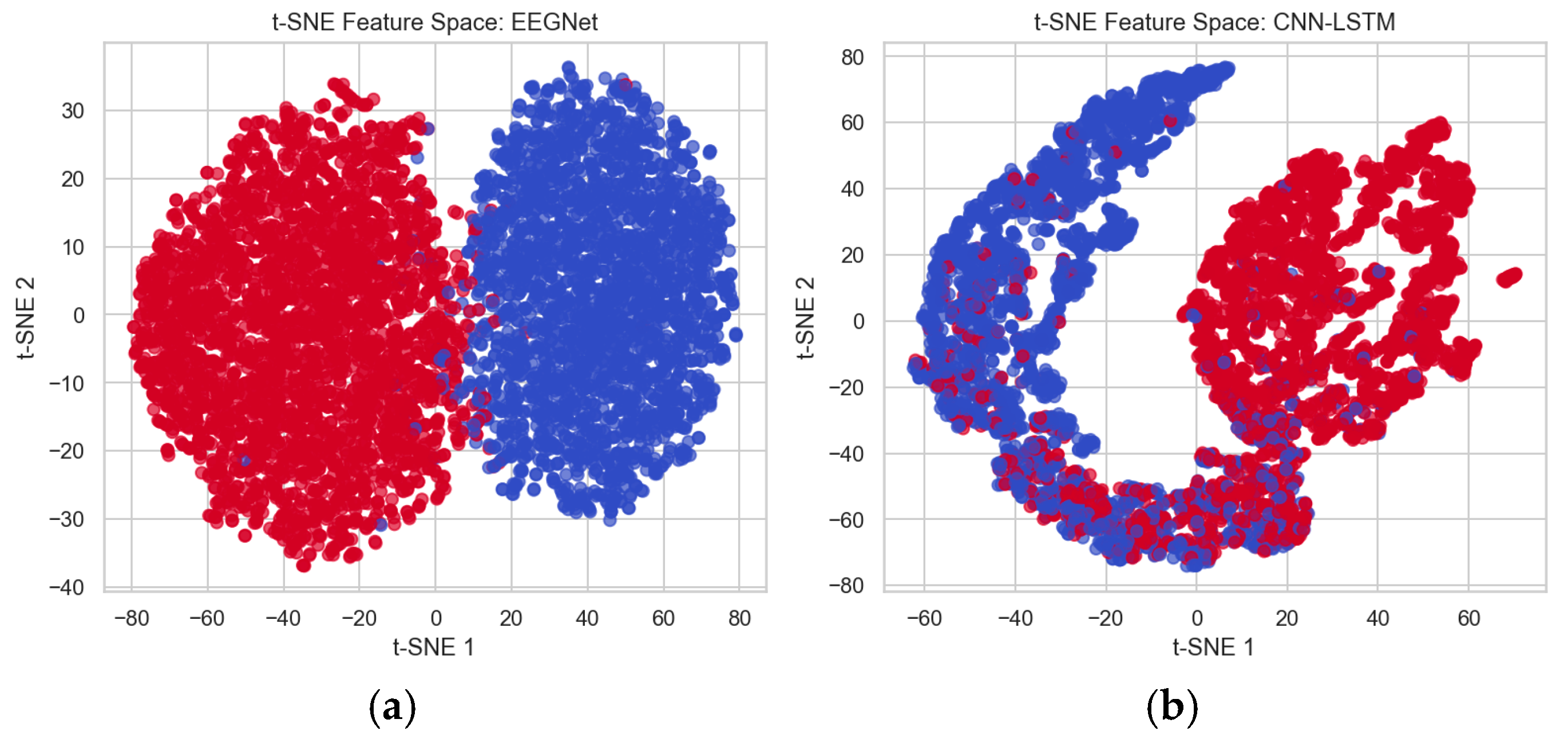 Figure 19a shows the feature space mapping between healthy and affected data points using EEGNet, and (b) shows the feature space mapping between healthy and schizophrenia patients’ data points using CNN-LSTM, where blue represents healthy controls and red represents affected patients.