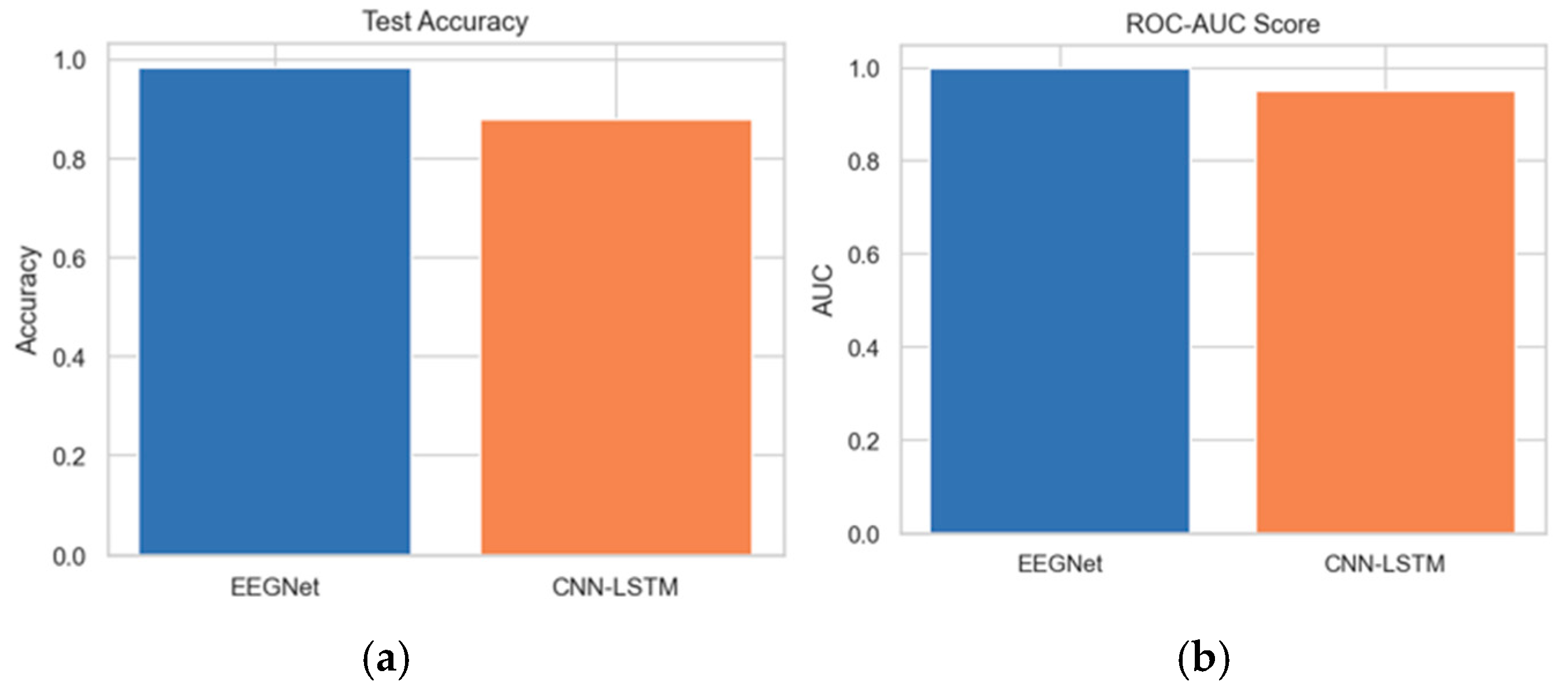 Figure 20a,b depict the test accuracy and ROC-AUC score between the EEGNet and CNN-LSTM architectures.