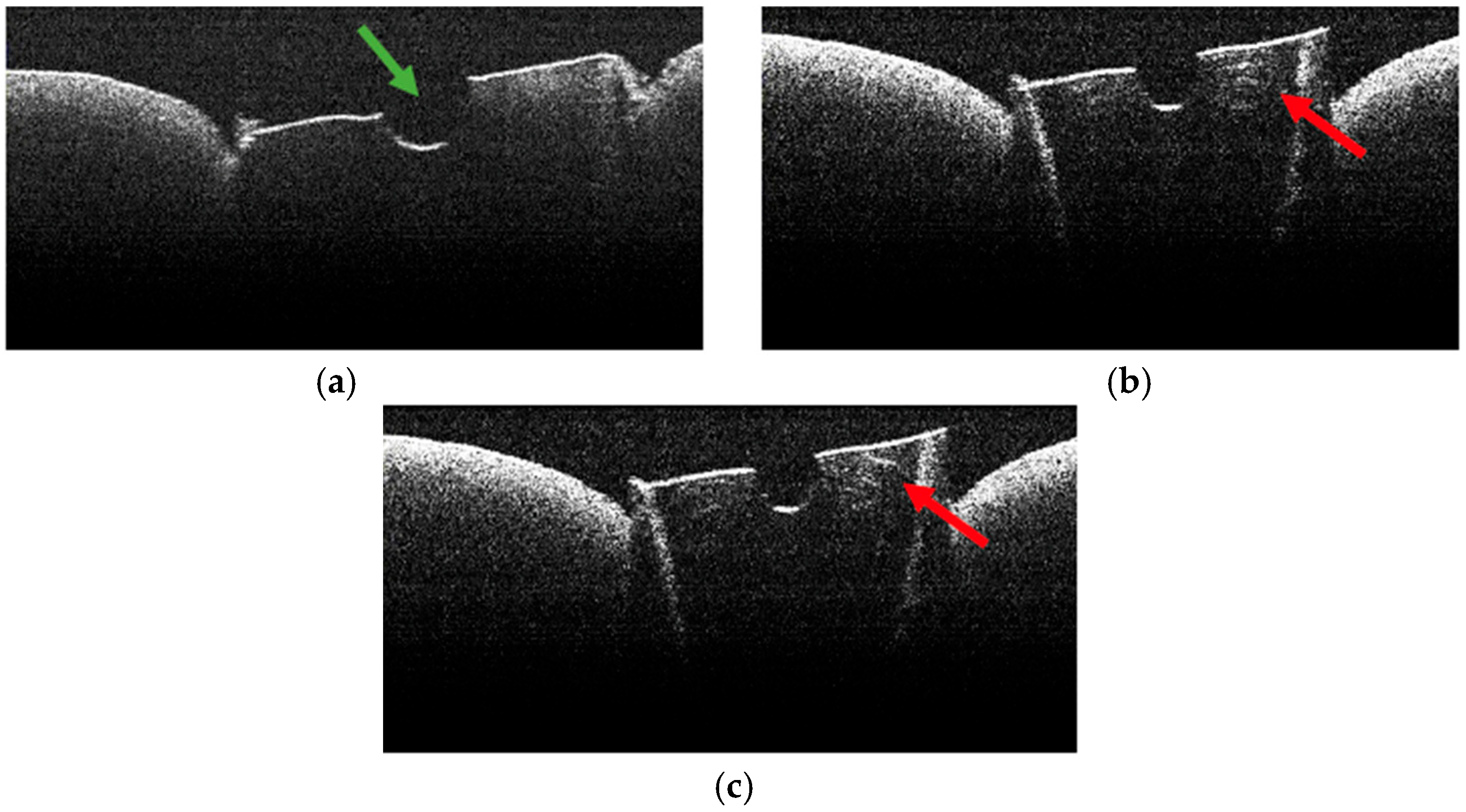 Figure 10. OCT images of specimen M11-a showing the empty root canal, indicated by the green arrow (a), and the lines of morphological alteration, indicated by the red arrows (b,c).