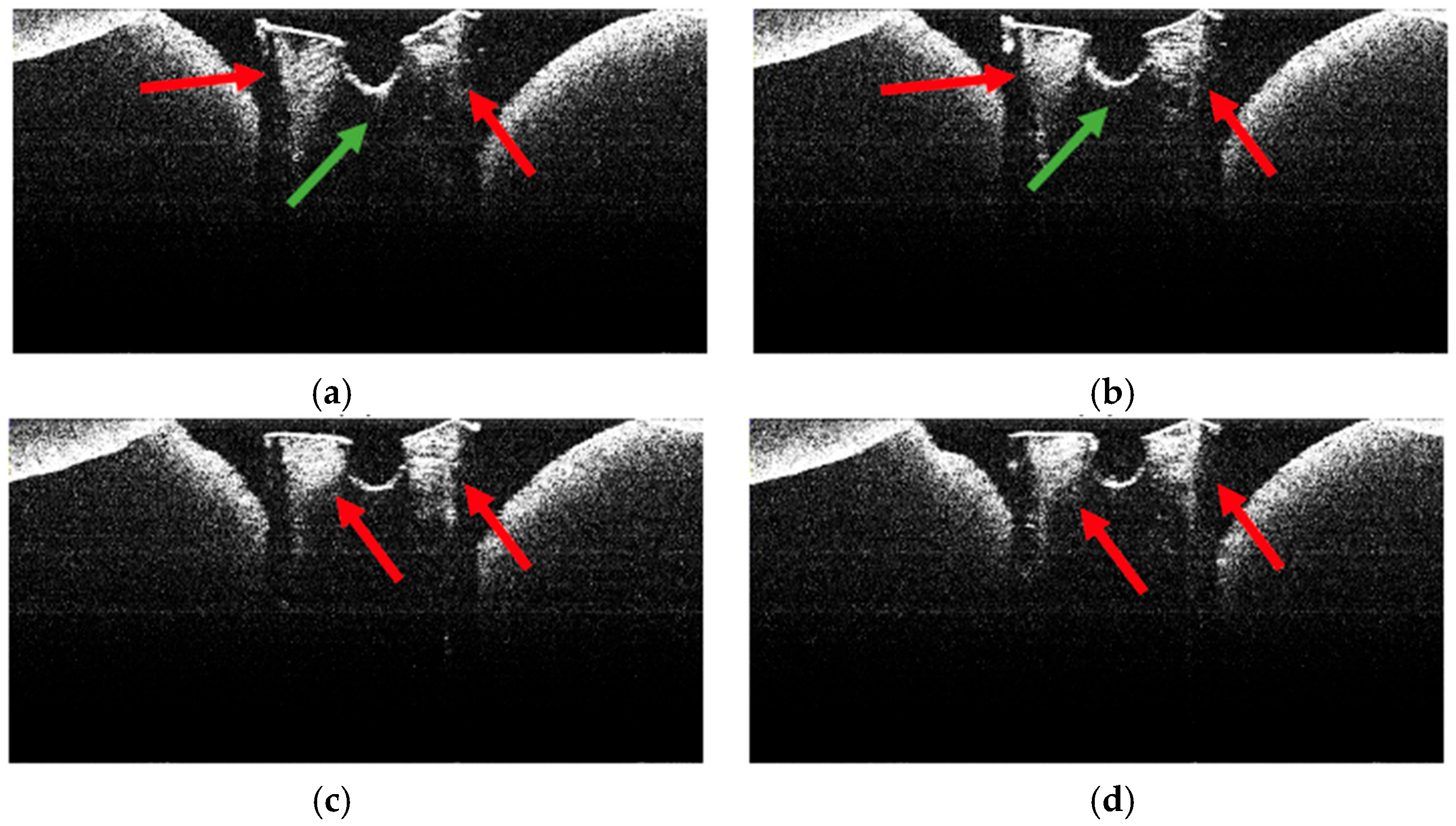 Figure 13. OCT images of specimen M17-a showing the empty root canal, indicated by the green arrow (a,b), and the areas of structural alteration of thermal origin, indicated by the red arrows (ad).