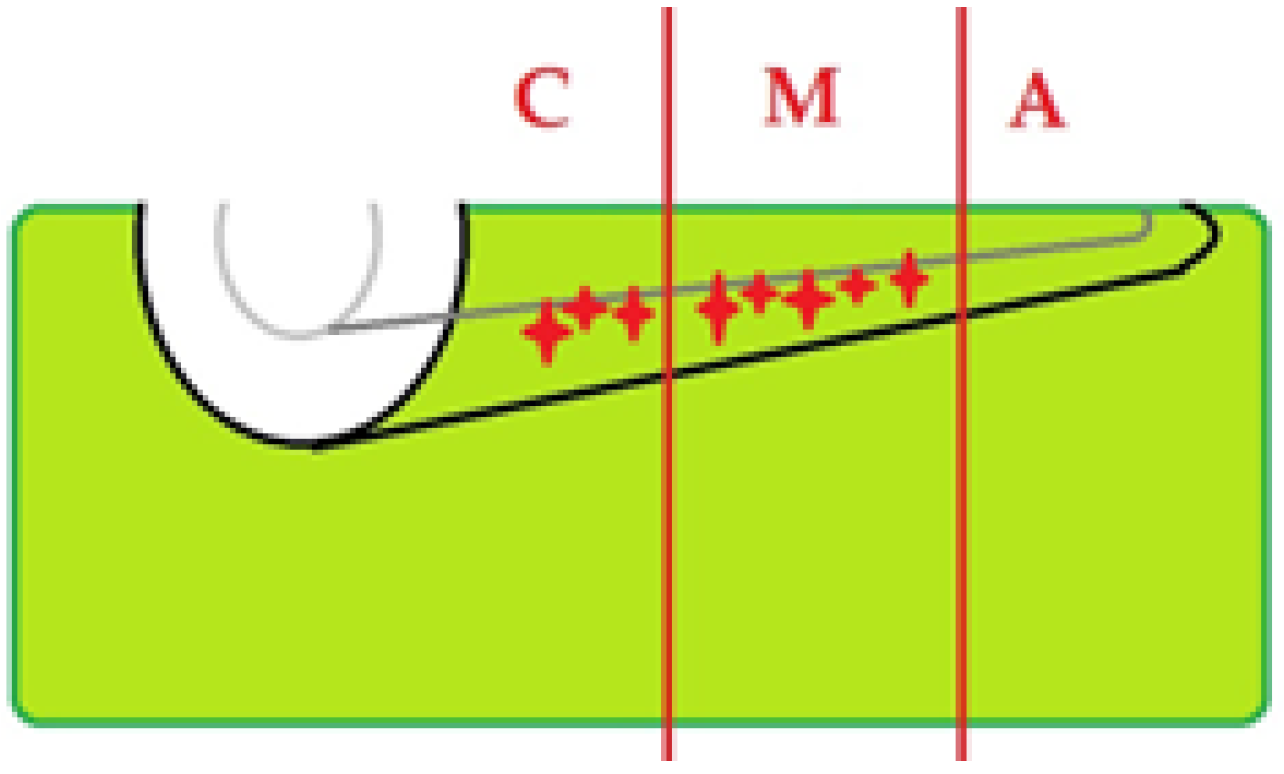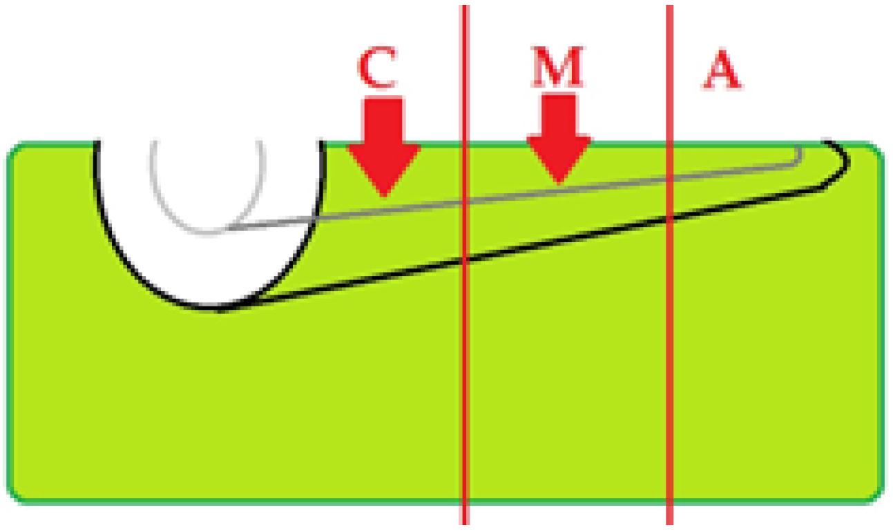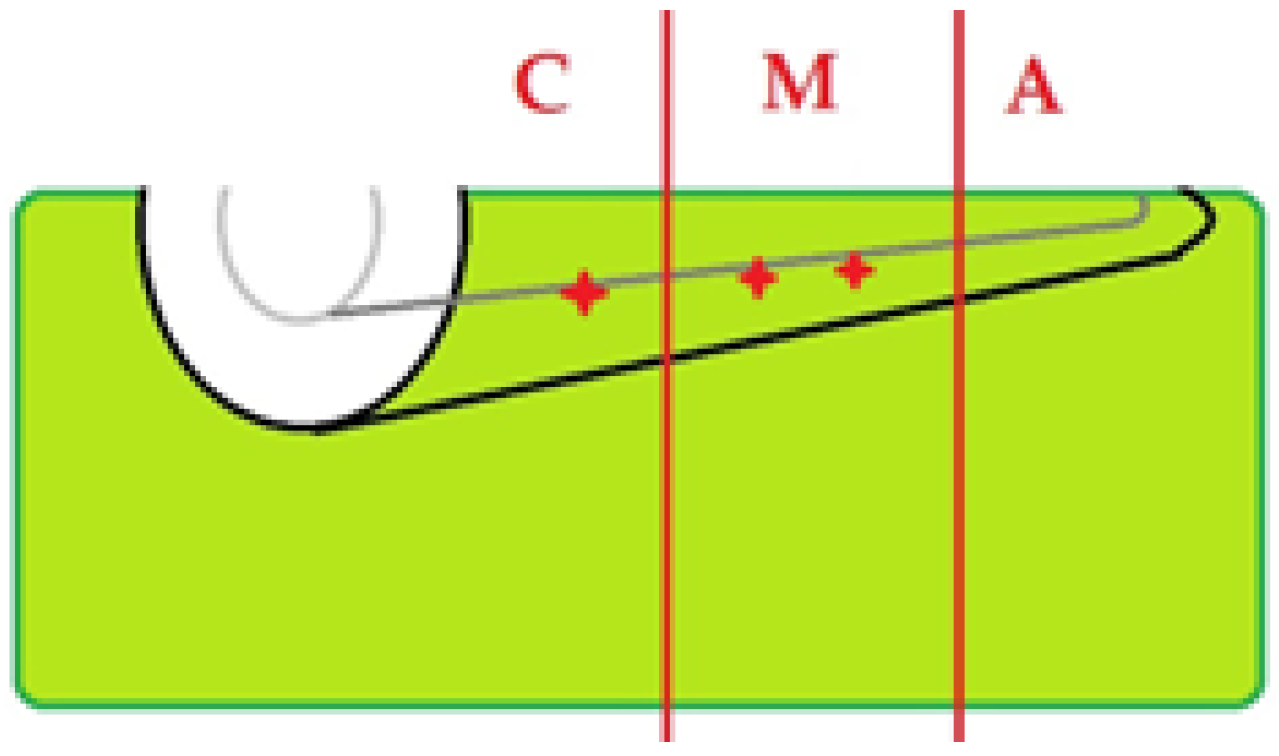Figure 16. Schematic of OCT examination of specimens—Illustration of TIMAs localization at the level of thirds of the roots: C—coronal, M—middle, A—apical.