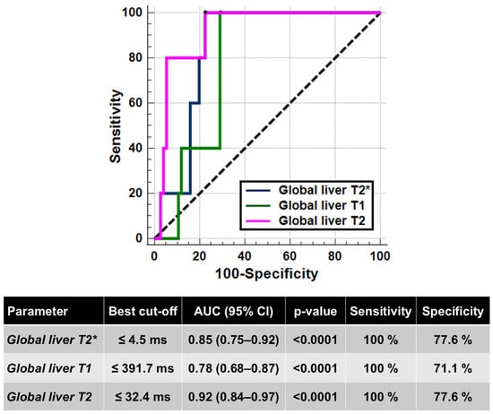 Five (6.2%) patients had hepatic cirrhosis. Compared to patients without cirrhosis, patients with cirrhosis had significantly lower global liver T2* values (3.42 ± 0.87 ms vs. 13.99 ± 9.50 ms; p = 0.010), T1 values (337.08 ± 18.26 ms vs. 445.52 ± 75.44 ms; p = 0.036), and T2 values (27.79 ± 2.77 ms vs. 38.49 ± 7.77 ms; p = 0.002), while age was not significantly different (44.62 ± 7.36 years vs. 37.70 ± 7.36 years; p = 0.158). No patient with cirrhosis had a normal relaxation time, suggesting a negative predictive value of 100% of all hepatic relaxation times for cirrhosis. One patient with cirrhosis had never contracted the HCV infection. Figure 2 shows the ROC curves and the best cut-offs of hepatic relaxation times for predicting the presence of hepatic cirrhosis. All three relaxation times were able to discriminate between the absence and the presence of cirrhosis (T2*: AUC = 0.85; T1: AUC = 0.78; T2: AUC = 0.92). The T2* showed a discriminatory ability comparable to that of T1 and T2 values (p = 0.417 and p = 0.344, respectively), while a significant difference was found between the AUCs of T1 and T2 values (p = 0.011).