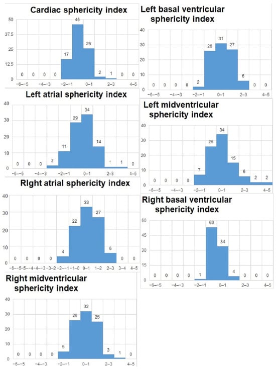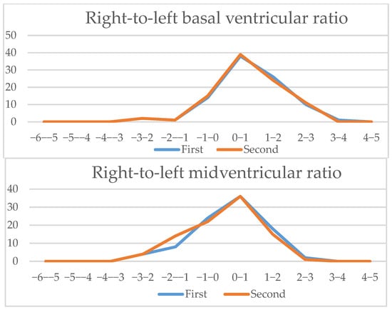 We compared the first 46 sets of measurements z-scores with the last 46 to check if they are significantly closer to 0 (hence, theoretically better in the second half of the study) using the Student t-test (Table 5). Regarding whether there is an improvement of measurement proficiency (measured by z-scores deviation) throughout the study (learning curve), we noticed this disposition with statistical significance (p < 0.05) only for a few parameters; we also noticed that for some parameters measurements had a smaller deviation from zero, but without statistical significance. The parameters that showed statistically significant measurement improvement were left atrial-to-heart area ratio, right atrial-to-heart area ratio, right ventricular-to-heart area ratio, and pulmonary valve.