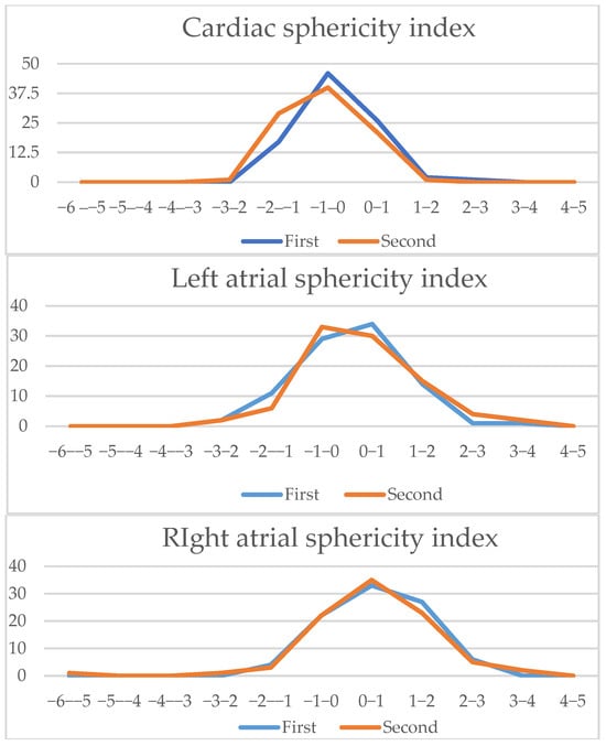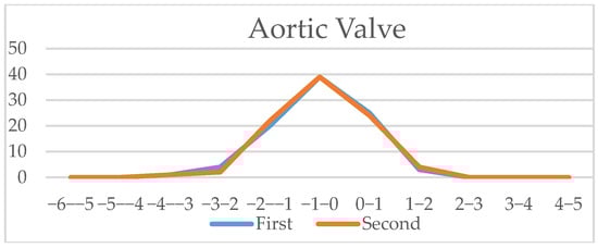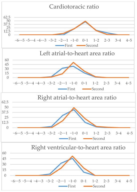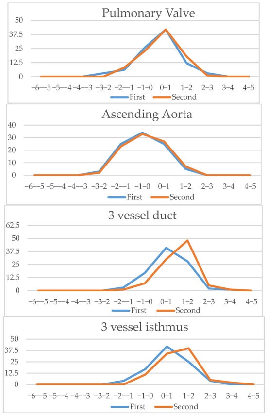 Since all measured values and z-scores had a normal Gaussian distribution, we could use the parametric Student t-test for paired data. We noticed that for certain parameters, there were significant differences when assessing if the measurement allowed for zero error. We also calculated the Pearson correlation coefficient to assess the similarity between the intra-observer measurements. The measurements’ results showed an excellent correlation coefficient for cardiac area, thoracic area, longitudinal cardiac diameter, transverse cardiac diameter, right ventricle area, left ventricle area, left ventricle longitudinal diameter, right atrial area, left atrial area, aortic valve and pulmonary valve, a good correlation coefficient for ascending aorta, three vessel isthmus, right ventricular longitudinal diameter, right ventricular basal diameter, left ventricular basal diameter, right ventricle midtransverse diameter, left ventricle midtransverse diameter, right atrial longitudinal diameter, left atrial longitudinal diameter, left atrial transverse diameter, and a fair correlation was noticed for right atrial transverse diameter and three vessel duct measurement. A detailed table of all measurements, z-scores, and centiles correlation coefficients is available in Appendix B; in Figure 6, Figure 7 and Figure 8 a graphic comparison of z-scores is available.