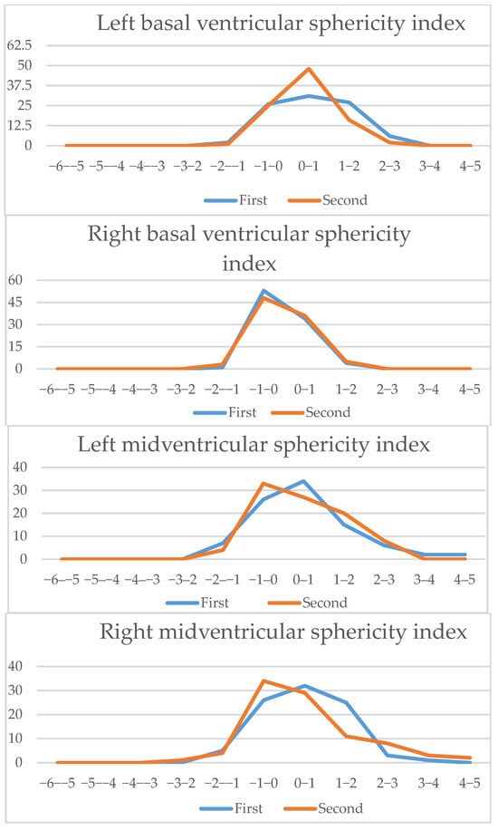 Four-chamber view parameters (2): Z-scores comparison of live-scan (first) and off-line (second) measurements (cardiac sphericity index, left atria sphericity index, right atria sphericity index, left basal ventricular sphericity index, right basal ventricular sphericity index, left midventricular sphericity index, right midventricular sphericity index).