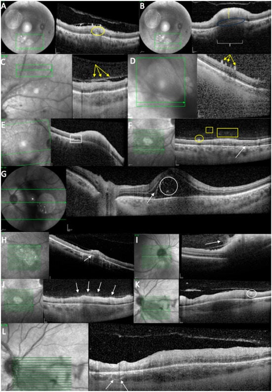 OCT scan at the time of diagnosis. (A) Intraretinal hyperreflectivities (circle) in the ONL, close to the TRC lesion. (B) Retinal hyperreflectivity (vertical bracket), increased thickness, RPE bowing (ellipse), and choroidal hyporeflectivity (horizontal bracket). (C) Posterior hyaloid hyperreflectivities (arrows). (D) ILM deposits (arrows). (E) RPE bumps (rectangle) and RPE bowing. (F) ILM deposits (circle), hyperreflective vitreous dots (square/rectangle), and subretinal fluid (arrow). (G) Subretinal hyperreflective dots (circle) and intraretinal fluid (arrow). (H) Increased RPE thickness (arrow). (I) “Hairy appearance” (arrow). (J) Hyperreflective dots above the blood vessels (arrows). (K) Hyperreflective dots around a retinal blood vessel (circle). (L) Hyperreflective dots around choroidal vessels (arrows).