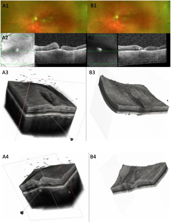 (A1) CFP at baseline, 10 days after symptom onset: white chorioretinal foveal lesion. (A2) OCT scan: parafoveal increased retinal thickness, with macular hole, increased RPE thickness, RPE bowing. (A3) Three-dimensional reconstruction showing increased retinal thickness around the fovea, with vitreous cells, thickened choroid, and RPE. (A4) Cross-section of the 3D model; increased retinal thickness is visualized at the edge of the fovea; dispersed vitreous cells. (B1) CFP 12 days from baseline, with retinal lesion starting to fade. (B2) OCT of the same horizontal slab as A2 showing decreased retinal thickness, multiple hyporreflective spaces, and almost flat RPE line. (B3) Large area surrounding the fovea of decreased retinal thickness showing irregular retinal surface. (B4) Section through the lesion showing altered retinal thickness with gliotic hyperreflective retinal tissue and less RPE bowing (see Supplementary Video S1).