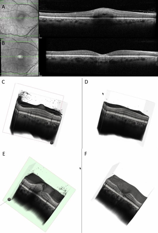 - Saxena, S.; Manisha Meyer, C.H. Three-dimensional spectral domain optical coherence tomography in X linked foveal retinoschisis. BMJ Case Rep. 2013, 2013, bcr2012007661. [Google Scholar] [CrossRef]
