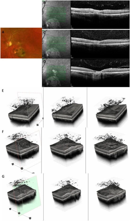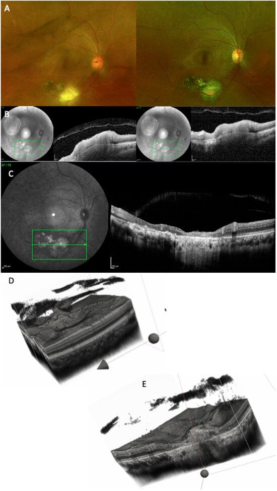 We acknowledge that a quantitative assessment of lesion size would have been valuable; however, this was not feasible given the current limitations of OCT technology and the reduced scan quality in patients with decreased vitreous transparency. These factors made precise volumetric measurements extremely challenging. At present, even when 3D reconstruction is successful, it allows only for a qualitative and dynamic evaluation of lesion evolution rather than a reliable quantitative analysis.