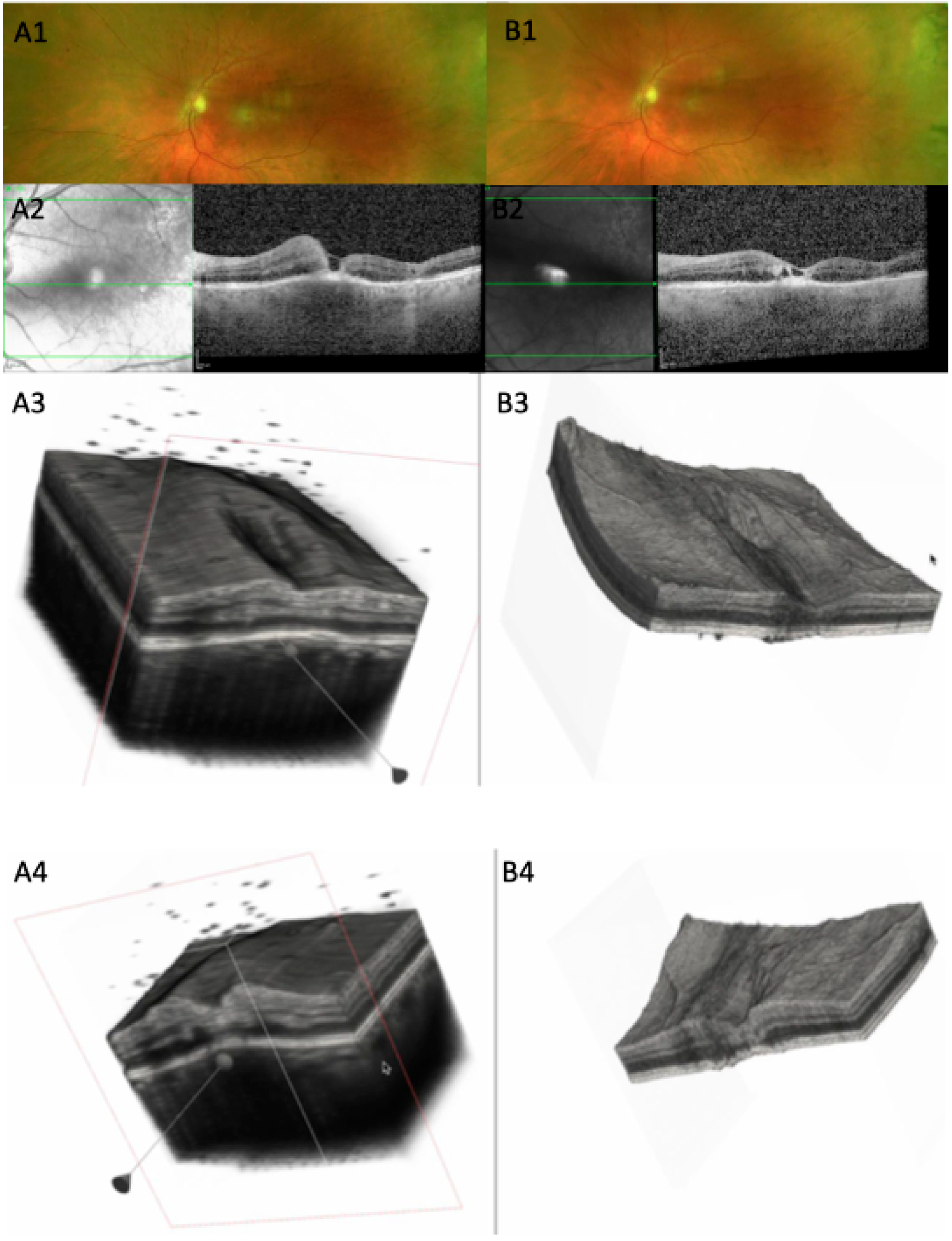 25]. The mean ratio between scarred and active lesion areas was 1.36 (range = 0.54–2.18). The increase in lesion area was observed in all our cases where reconstruction was performed, explained by the perilesional retinal disorganization.