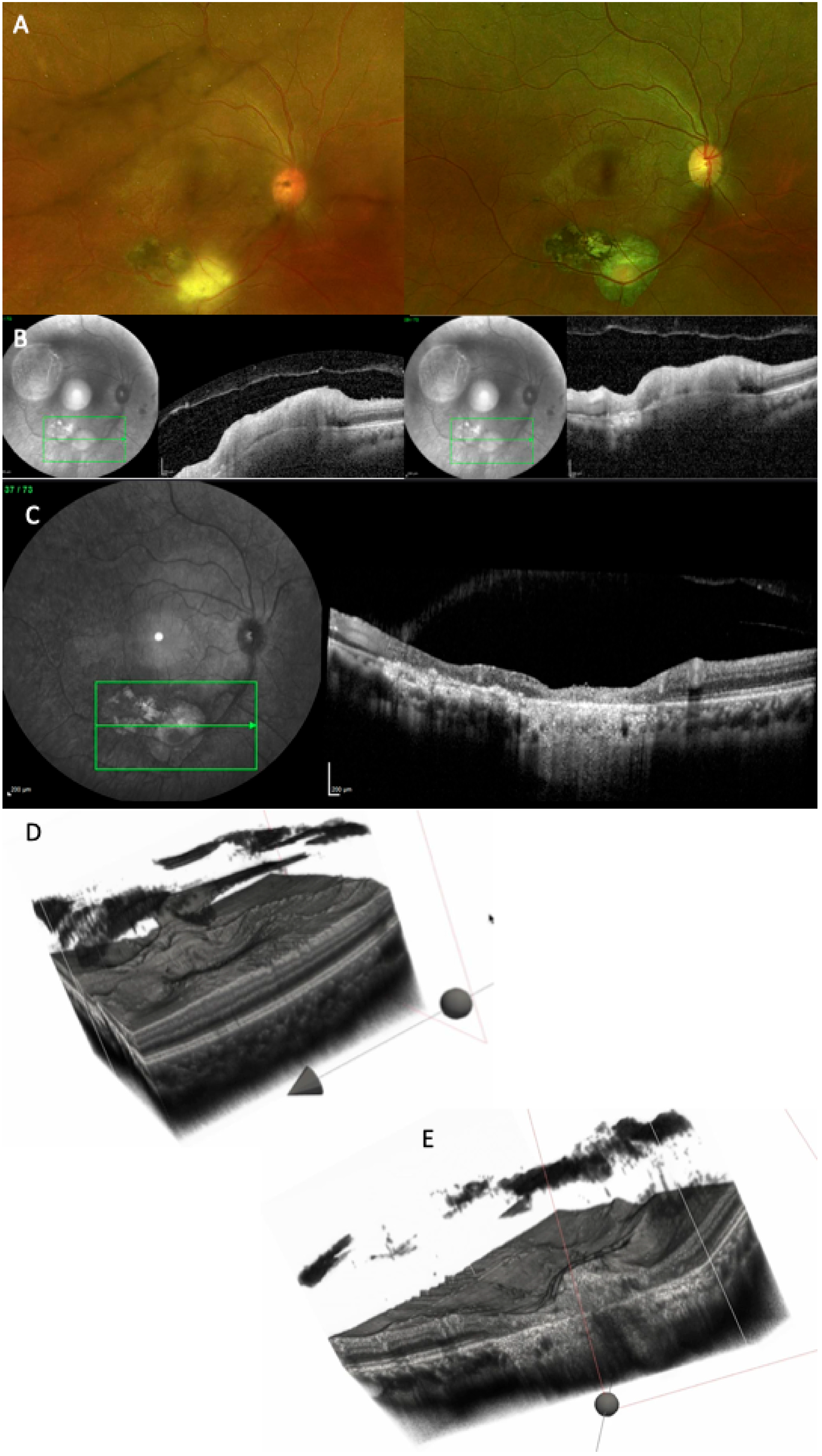 As expected for a retrospective analysis, our study has several limitations. The sample size was inherently limited due to the exclusion criteria applied, including the requirement for at least two acquisitions at different time points. In many cases, the degree of initial vitritis precluded OCT imaging, which substantially reduced the pool of eligible patients, despite the database containing a much larger number of potential cases. Furthermore, the image processing and reconstruction workflow was not fully automated; layer isolation and segmentation required partial manual intervention. This labor-intensive process constrained the feasibility of including additional patients in the analysis. A more standardized and well-defined image acquisition protocol would have allowed for more accurate comparisons both between patients and in the same patient over time. However, the selected protocol was appropriate given the degree of vitritis observed; in cases with marked medium opacity, high-detail imaging protocols cannot be reliably obtained. Motion artifacts, vitritis, and shadowing occasionally obscured lesion boundaries, making accurate delineation challenging across all slices. Additionally, the absence of histopathologic correlation restricts definitive interpretation of certain OCT features. Furthermore, quantification of the lesion’s volume was not attempted due to a difficult delineation of the exact limit of the active TRC which would have been challenging. Other potential limitations could be image misalignment software interpolation errors or missing data in areas of full-thickness retinal loss. Ideally, our analysis would have relied solely on acquisitions with a high number of sections, which would have enabled a reconstruction more closely reflecting the true anatomical appearance and reduced the need for interpolation. Although this limitation can make visual comparisons more challenging, the quantitative assessment of the B-scans across the lesions remains valid, as our analysis accounted for the acquisition-specific parameters, including the spacing between sections.