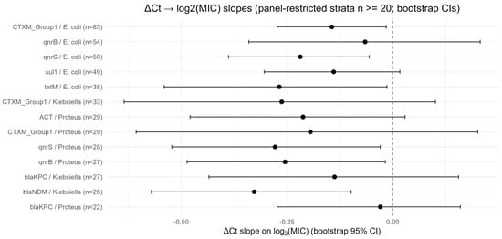 E. coli: sensitivity 0.94 [95% CI 0.88–0.97], specificity 0.995 [95% CI 0.990–0.998], κ ≈ 0.93). Mixed models showed modest but significant Ct→MIC associations for select markers (e.g.,