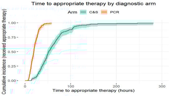 Proteus). ROC AUCs for ΔCt prediction of non-susceptibility ranged from 0.62 to 0.81 (95% CIs ≈ 0.47–0.97). Clinically, PCR guidance shortened median time to antibiotic initiation (20 h vs. 52 h) and increased treatment success (88.1% vs. 78.1%; adjusted OR 1.95 [95% CI 1.12–3.40],