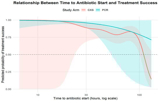p = 0.002) of the treatment success benefit was mediated through earlier antibiotic initiation.
