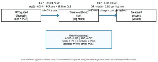 n = 169) arms for time-to-antibiotic and treatment success using adjusted logistic regression and causal mediation (time-to-antibiotic as mediator; bootstrap inference).