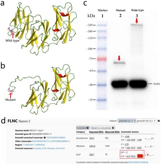 Structural and functional consequences of the FLNC (NM_001458.5:c.1453C>T, p.Q485*) variant. (a) Predicted 3D structural model of the wild-type FLNC protein. (b) Predicted 3D structural model of the mutant FLNC (p.Q485*) protein showing premature truncation and loss of the C-terminal region. (c) Western blot analysis demonstrating a truncated ~70 kDa mutant FLNC protein (Lane 2, red arrow) compared with the full-length ~289 kDa wild-type FLNC protein (Lane 3, red arrow). (d) gnomAD v2.1.1 constraint metrics for FLNC, demonstrating strong intolerance to predicted loss-of-function variants. The gene shows a pLI of 1.0 and an LOEUF of 0.25 (highlighted in the red box), indicating the marked depletion of LoF variants in the general population and supporting a loss-of-function mechanism for the p.Q485* variant.