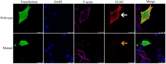 Structural modeling predicted that the p.Q485* variant results in premature truncation of FLNC, resulting in the loss of its C-terminal domains (Figure 3a,b). Functional analyses in a rat-heart-derived cell line demonstrated that wild-type FLNC produced a full-length ~289 kDa protein, whereas the mutant construct yielded a truncated ~70 kDa protein, as shown via Western blotting (Figure 3c). Immunofluorescence staining revealed the markedly reduced expression of the mutant FLNC protein compared with the wild-type control, without evidence of abnormal cytoplasmic aggregate formation (Figure 4).