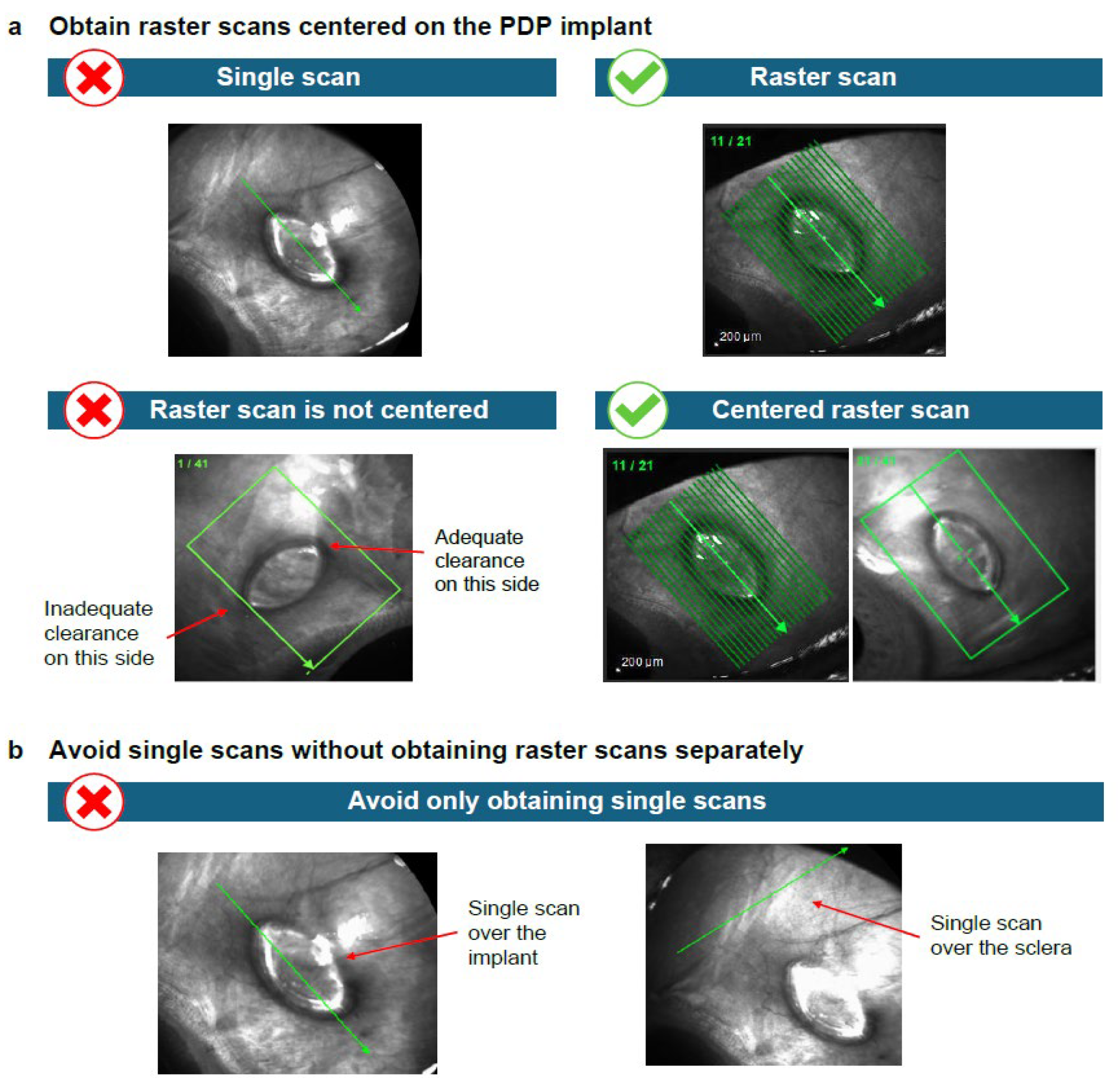 Figure 3). Raster scans should capture the entirety of the PDP implant, including temporal and nasal flange edges and adjacent sclera; however, it is important to note that complete visualization of the sclera beneath the implant flange may not be possible. Following identification of the long and short axes of the PDP implant flange (