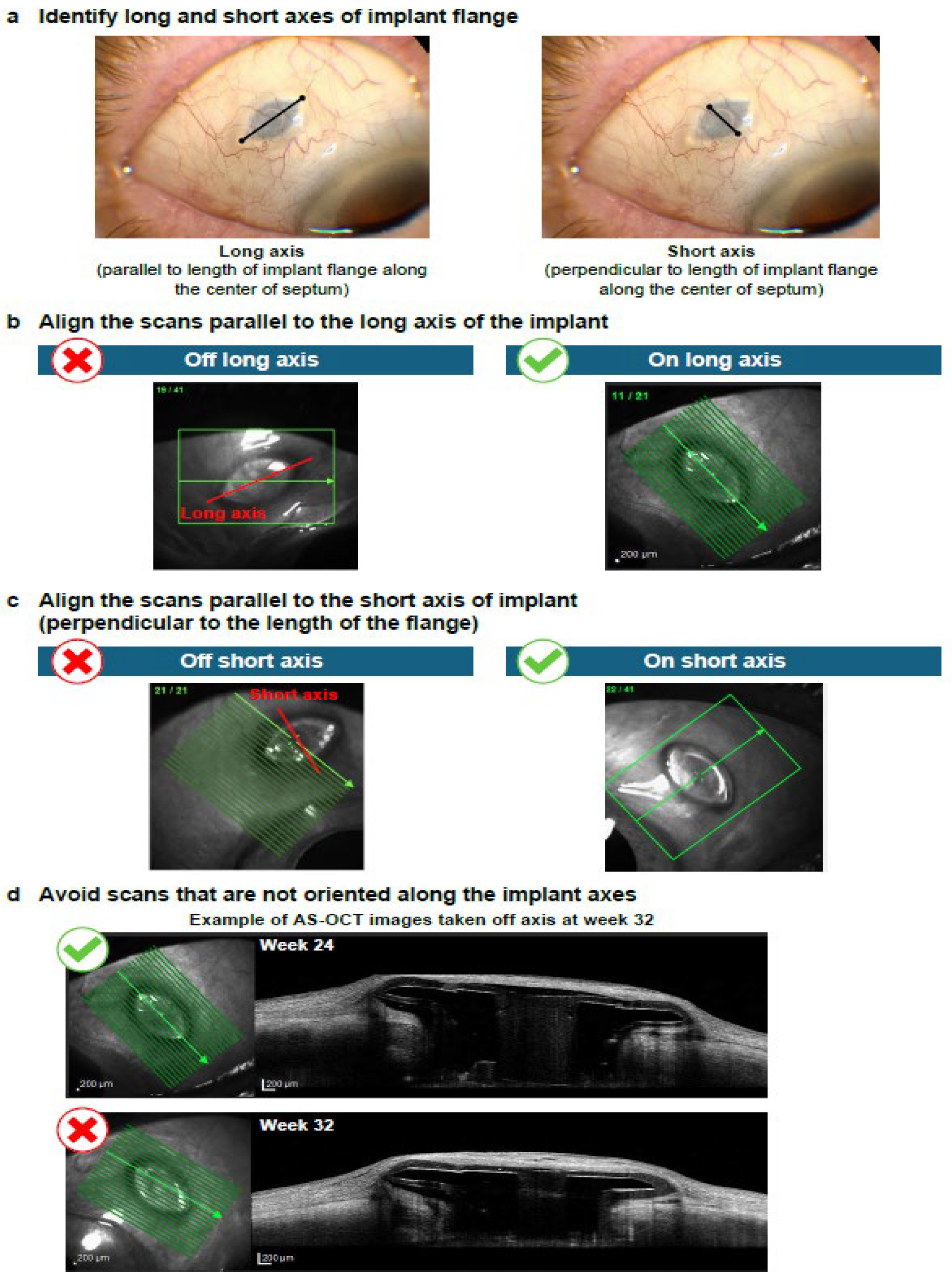 13], it is imperative to adhere to a standard procedure to reduce artifacts, thereby ensuring quality and interpretability of the image. AS-OCT scan settings help optimize the number of B-scans (ART settings) obtained and identify areas in relation to the implant. During clinical development of the PDP, different ART settings, varying numbers of B-scans, and different image acquisition areas were used to reduce artifacts and optimize image quality during AS-OCT scanning. To determine if the PDP implant was imaged per the acquisition procedure, the following considerations were made: (1) whether the scan was centered on the implant; (2) whether the scan depth was appropriate (i.e., sufficient to visualize the relevant structures); (3) whether a sufficient scan length and number of scans collected; and (4) whether the focus of the scan appropriate?