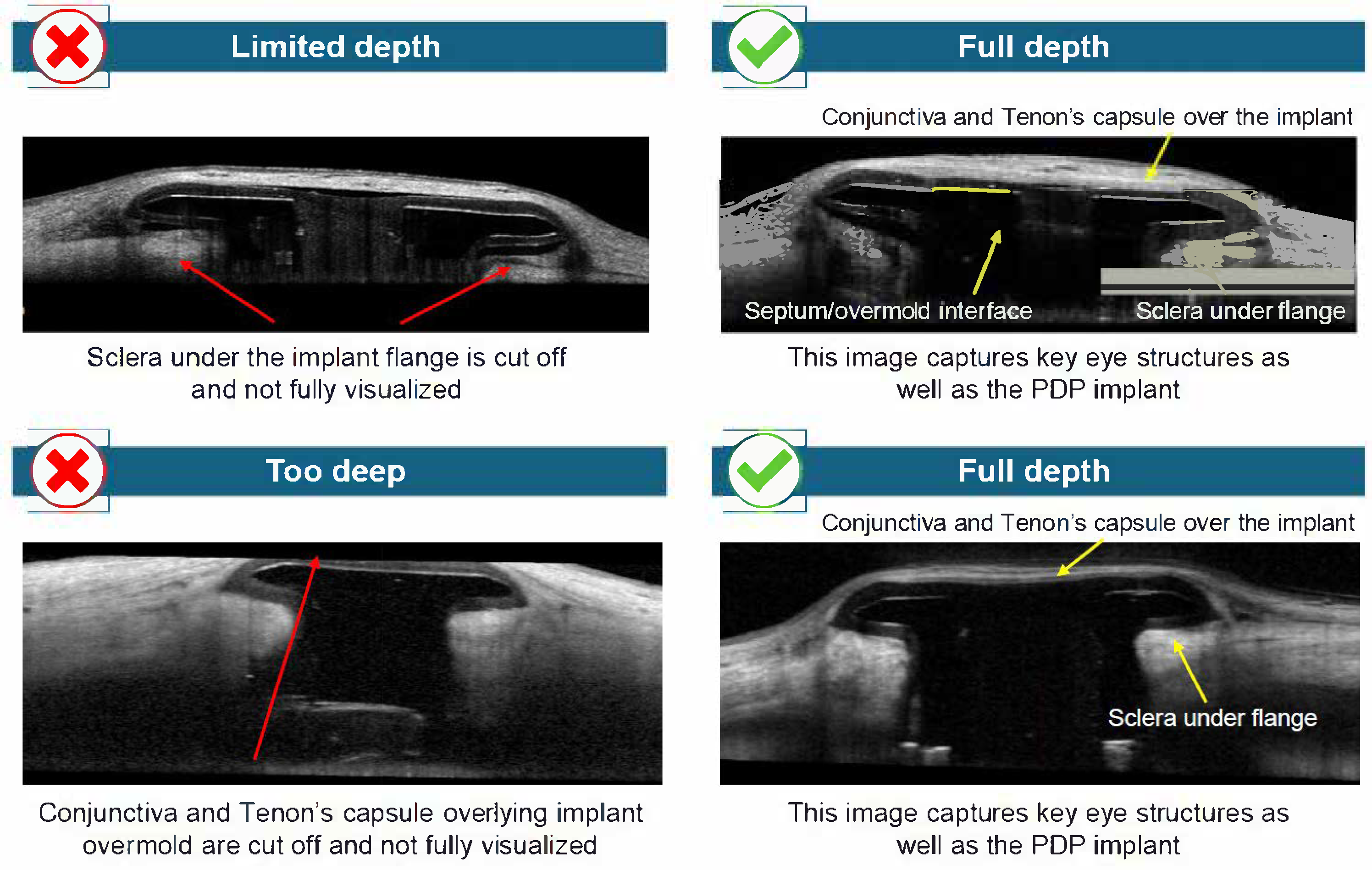 Utilization of AS-OCT during clinical development of the PDP allowed visualization of AS features, including the conjunctiva, Tenon’s capsule, and sclera surrounding the implant, and may potentially be used to supplement slit-lamp examination. The implant flange and septum were generally well defined in both long- and short-axis scans, particularly when raster scans were centered and aligned with the axis of the device. The conjunctival and Tenon’s capsule layers could be distinguished in most cases, and there was variable overlying tissue thickness among eyes with the PDP implanted. The scleral interface beneath the implant was visualized with adequate depth in EDI mode, allowing for assessment of implant depth and any potential tissue reaction or shadowing. Overall, the procedure enabled detailed structural imaging of the implant’s interface with surrounding ocular tissues. Techniques that consistently improved image quality included external fixation positioning and eyelid adjustment. Common errors resulting in poor image acquisition included raster scans that were not centered, leading to inadequate clearance on one side of the PDP implant flange; scans that were not aligned parallel to the long and/or short axes of the PDP implant flange; and scans obtained at inappropriate scan depths. Inappropriate scan depth resulted in ocular features not being fully visualized in AS-OCT images (e.g., full visualization of the conjunctiva and Tenon’s capsule was not achieved when the scan depth was too high). No overall differences in image quality or anatomical detail were observed between long- and short-axis scans. The orientation of the scans, whether on the long axis or short axis, did not impact image detail quality.