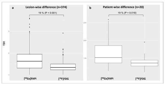 In the per-lesions analysis, [68Ga]Ga-FAPI identified more active lesions and showed a 19% higher uptake than [18F]FDG (TBRFAPI: 1.7 ± 0.5 vs. TBRFDG: 1.4 ± 0.2; p < 0.001) (Figure 2a). In the patient-based analysis, TBRFAPI was significantly higher (+19%) compared to TBRFDG (TBRFAPI: 1.7 ± 0.4 vs. TBRFDG: 1.4 ± 0.2, p = 0.02) (Figure 2b).