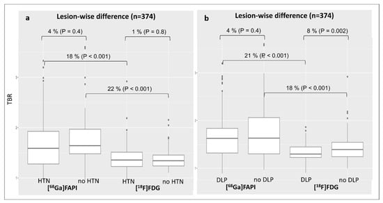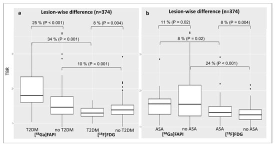 Each lesion was annotated with dichotomous parameters (yes/no) available from clinical data, particularly hypertension, T2DM, and ASA intake. Lesion TBRs were separated according to the presented groups, and mean ± standard deviation (SD) and differences between groups (in percent) were calculated, whereby statistical significances were evaluated with Student’s t-test and, in the case of comparisons between tracers, with the paired Student’s t-test. A two-sided p-value of <0.05 was considered statistically significant. For subgroup comparisons, a Bonferroni correction was applied, and thus, p < 0.01 was considered significant.