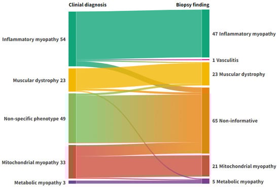 Alluvial plot representing the flow of diagnoses from clinical phenotyping to muscle biopsy. Left axis: Clinical diagnosis. Right axis: Biopsy diagnosis. Non-informative: Normal biopsies or biopsies with discrete unspecific changes. Figure created with Flourish Studio.