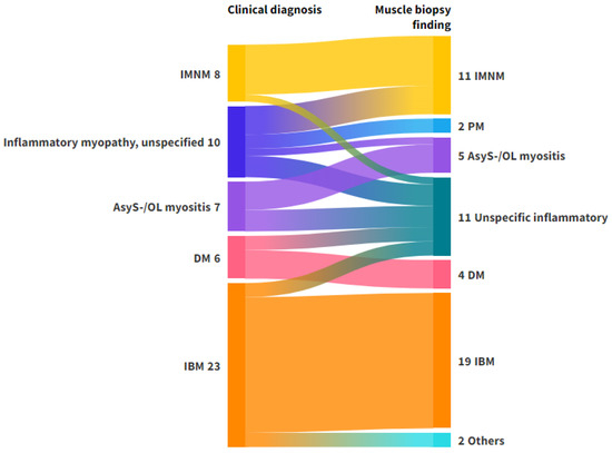 Alluvial plot representing the flow of diagnoses from clinical phenotyping to muscle biopsy in patients with a clinical diagnosis of inflammatory myopathy. Left axis: Clinical diagnosis. Right axis: Biopsy diagnosis. The clinical diagnosis ‘Inflammatory myopathy, unspecified’ includes patients with suspected myositis who could not be classified on clinical grounds, including antibody testing. The muscle biopsy finding ‘others’ consisted of patients with vasculitis (n = 1) and muscular dystrophy (n = 1). The muscle biopsy finding ‘unspecific inflammatory’ was used for biopsies with inflammatory findings, which were not specific for any of the subtypes. Abbreviations: AsyS-/OL myositis, antisynthetase syndrome/overlap myositis; DM, dermatomyositis; IBM, Inclusion Body Myositis; IMNM, immune-mediated necrotizing myositis; PM, Polymyositis. Figure created with Flourish Studio.