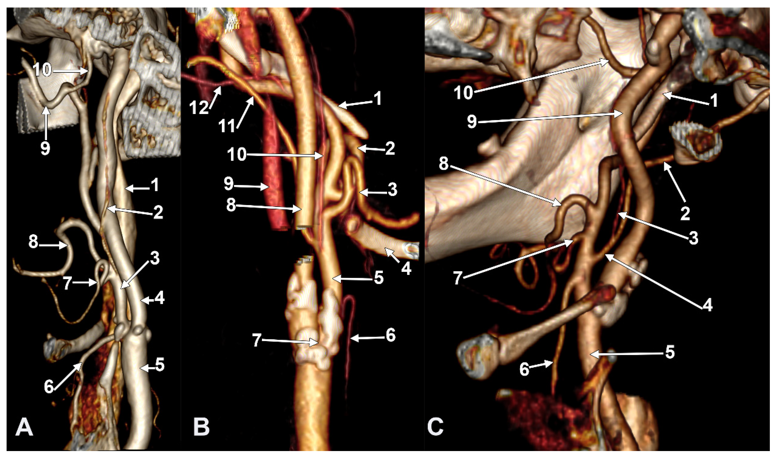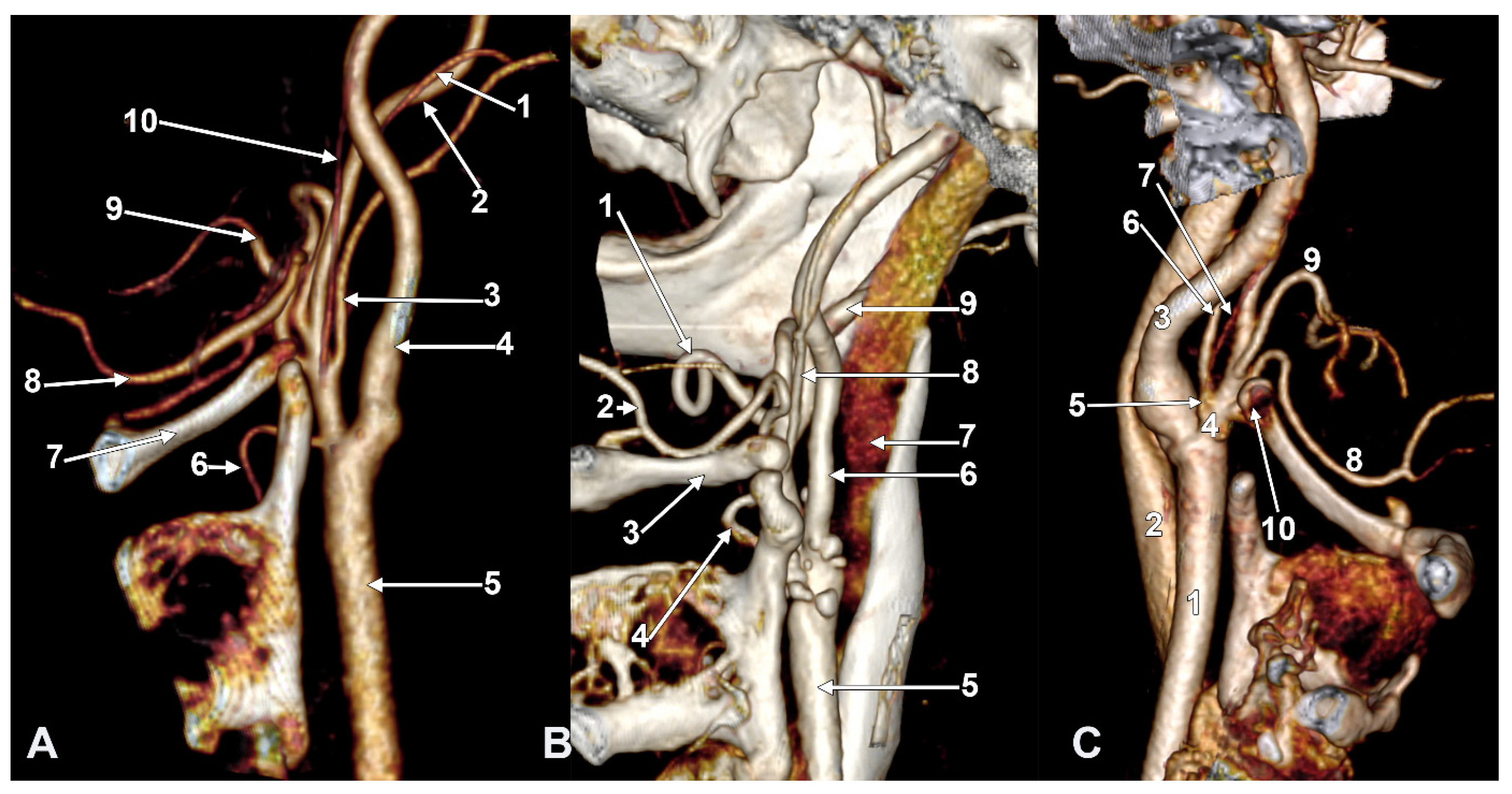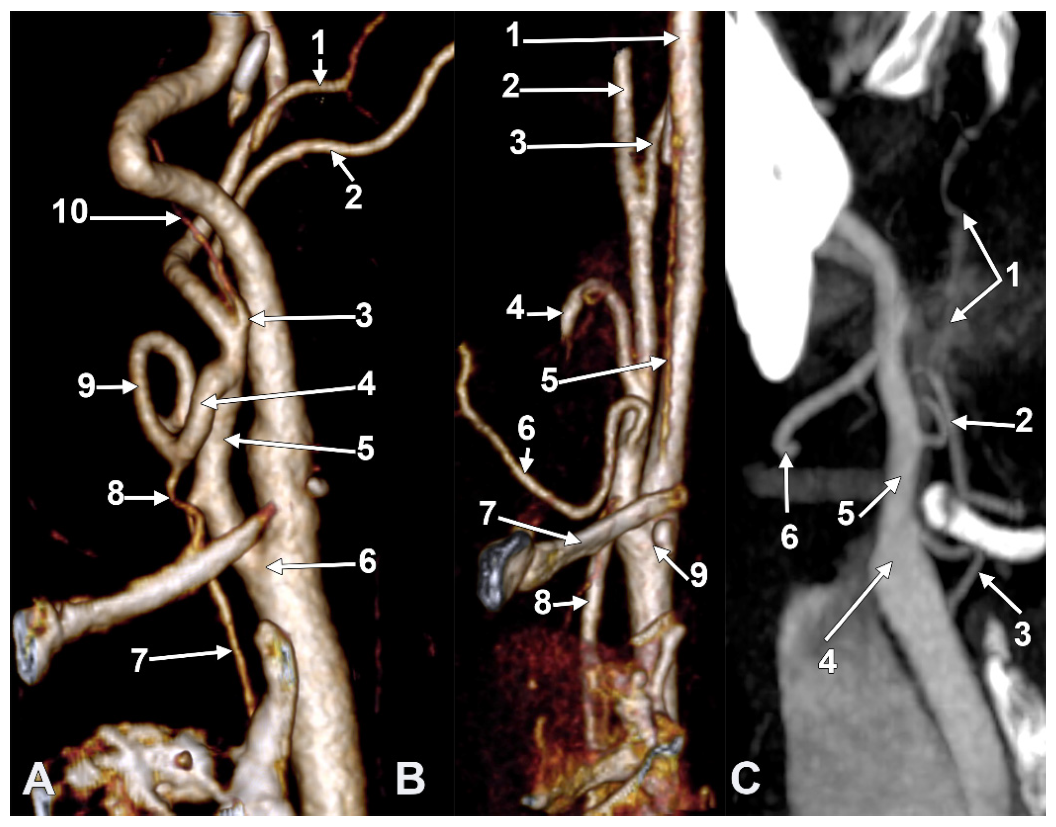 (A) Infrahyoid origin of the ascending pharyngeal artery. Linguofacial trunk. Three-dimensional rendering. Antero-infero-medial view. 1. Posterior auricular artery; 2. external carotid artery; 3. occipital artery; 4. internal carotid artery; 5. common carotid artery; 6. superior thyroid artery; 7. greater hyoid horn; 8. lingual artery; 9. facial artery; 10. ascending pharyngeal artery. (B) The hyoid origin of the ascending pharyngeal artery, lateral to the greater hyoid horn. Three-dimensional volume rendering. Right side. Posteromedial view. 1. Facial artery; 2. lingual artery; 3. greater hyoid horn; 4. superior thyroid artery; 5. common carotid artery; 6. internal carotid artery; 7. internal jugular vein; 8. ascending pharyngeal artery; 9. external carotid artery. (C) Occipitopharyngeal trunk and absent superior thyroid artery. Type S 37 of sequence of the origin of the external carotid branches. Three-dimensional rendering. Left side. Medial view. 1. Common carotid artery; 2. internal jugular vein; 3. internal carotid artery; 4. external carotid artery; 5. occipitopharyngeal trunk; 6. occipital artery; 7. ascending pharyngeal artery; 8. lingual artery; 9. facial artery; 10. hyoid tubercle.