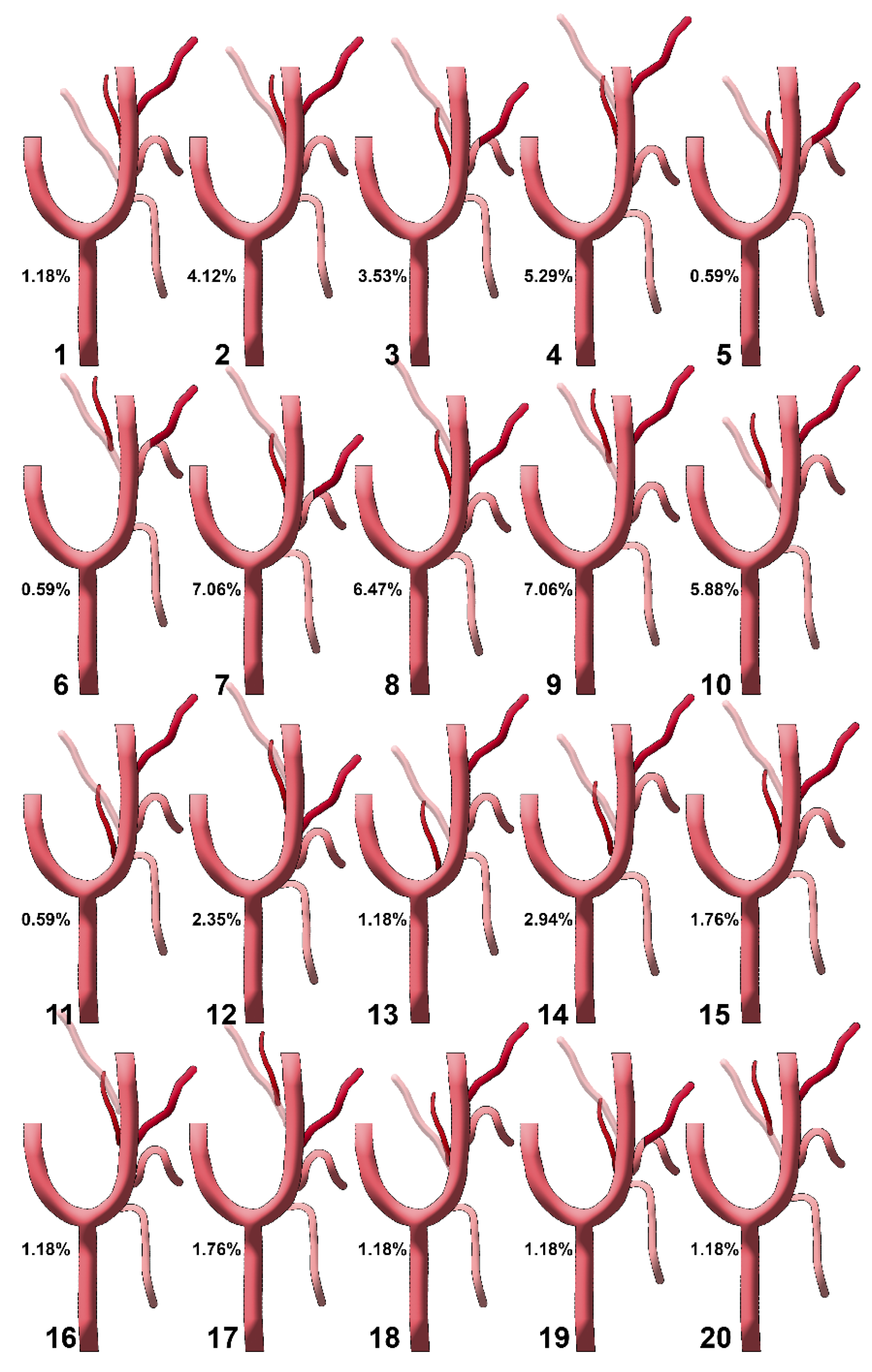 Diagrams of sequence types 1–20 of the origin of the ascending pharyngeal artery from the external carotid artery. Their prevalences are shown. Type 1: STA-OA-LA-APA-FA; type 2: STA-LA-APA/OA-FA; type 3: STA-APA/LFT-OA; type 4: STA-LA-APA-OA-FA; type 5: STA-APA/LFT/OA-FA; type 6: STA-LFT/OPT; type 7: STA-LFT-APA-OA; type 8: STA-LA-APA-FA-OA; type 9: STA-LA-OPT-FA; type 10: STA-OPT-LA-FA; type 11: STA/APA-LA/OA-FA; type 12: STA-LA-FA-APA-OA; type 13: APA-STA-OA-LA-FA; type 14: STA-APA-OA-LA-FA; type 15: STA-LA/APA-OA/FA; type 16: STA-LA-APA/FA-OA; type 17: STA-LA-FA-OPT; type 18: STA-APA/OA-LA-FA; type 19: STA-LFT/APA-OA; type 20: STA-OPT/LA-FA. STA: superior thyroid artery; LA: lingual artery; FA: facial artery; OA: occipital artery; APA: ascending pharyngeal artery; OPT: occipitopharyngeal trunk; LFT: linguofacial trunk.