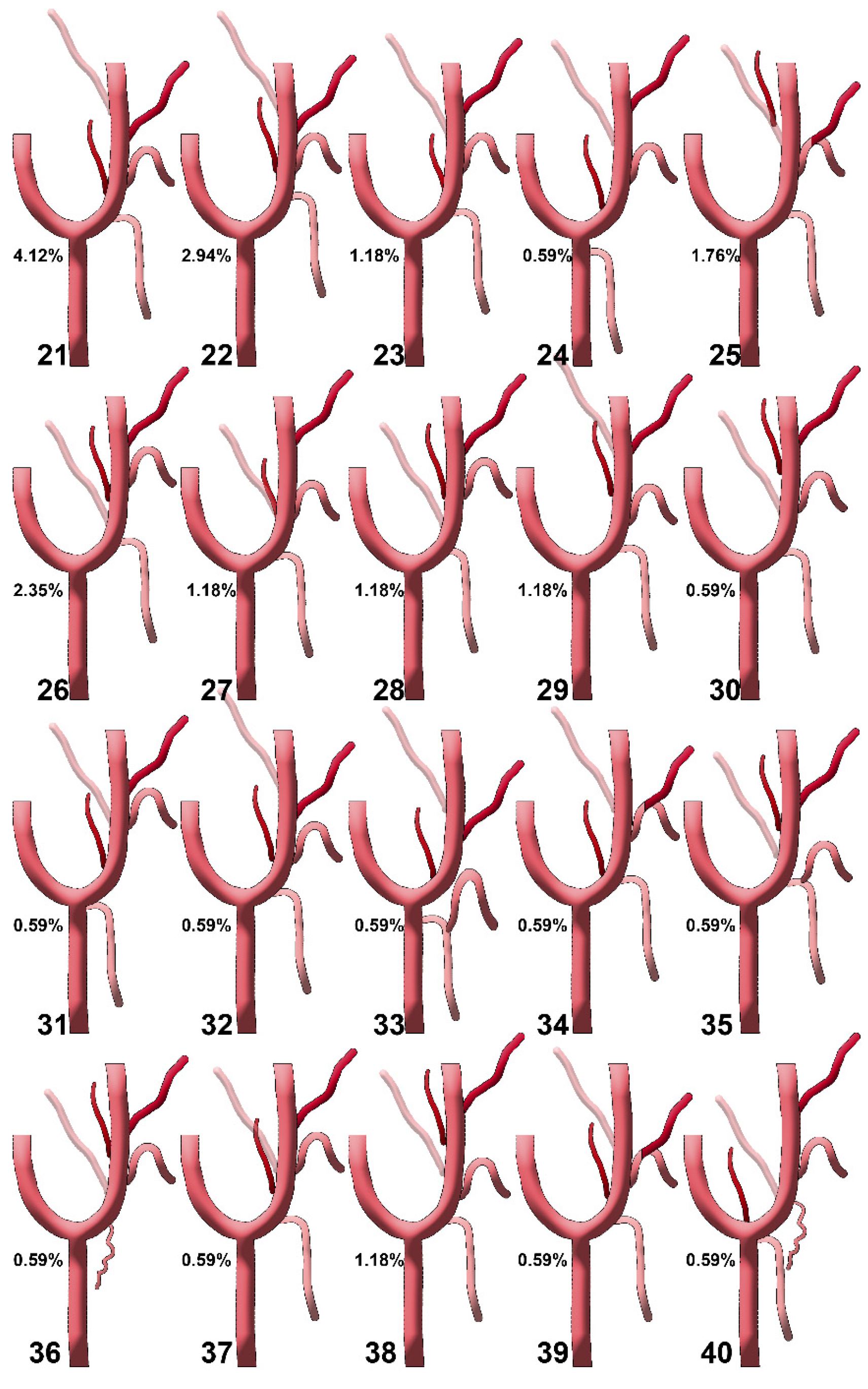 Diagrams of sequence types 21–40 of the origin of the ascending pharyngeal artery from the external carotid artery. Their prevalences are shown. Type 21: STA-APA-LA-FA-OA; type 22: STA-LA/APA-FA-OA; type 23: STA-APA-LA-OA-FA; type 24: APA-LA-OA-FA (STA from CCA); type 25: STA-LFT-OPT; type 26: STA-OA-APA-LA-FA; type 27: STA-LA/APA/OA-FA; type 28: STA-OA-LA/APA-FA; type 29: STA-LA-APA-FA/OA; type 30: STA-LA/OA-APA-FA; type 31: STA (from CB)-APA-LA/OA-FA; type 32: STA-APA/LA-FA-OA; type 33: TLT (from CCA)-APA-FA-OA; type 34: STA/APA-LFT-OA; type 35: TLT (from ECA)-OA-APA-FA; type 36: (S0, STA absent or with internal carotid origin)-SCM br.-OA-LA-APA-FA; type 37: STA-APA-LA/OA-FA; type 38: STA-LA-OA-APA-FA; type 39: STA-APA-LFT-OA; type 40: STA/APA from CB-OA/SCM br.-LA-FA. STA: superior thyroid artery; LA: lingual artery; FA: facial artery; OA: occipital artery; APA: ascending pharyngeal artery; CCA: common carotid artery; CB: carotid bifurcation; CCA: common carotid artery; ECA: external carotid artery; OPT: occipitopharyngeal trunk; LFT: linguofacial trunk; TLT: thyrolingual trunk; SCM br.: sternocleidomastoid branch.
