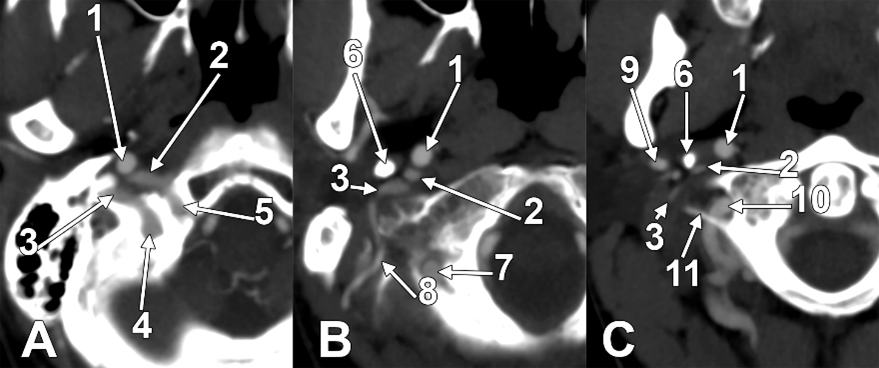 Successive axial sections from superior to inferior (A–C) through the long inferior petrosal sinus. Right side. Inferior views. 1. Internal carotid artery; 2. inferior petrosal sinus; 3. internal jugular vein; 4. sigmoid sinus; 5. anterior condylar vein; 6. styloid process; 7. vertebral artery; 8. occipital artery; 9. external carotid artery; 10. vertebral artery; 11. transverse process of the atlas.