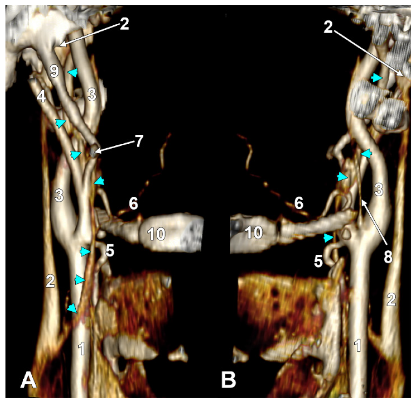 Long inferior petrosal sinus (arrowheads). Internal carotid origin of the ascending pharyngeal artery. Right side. (A) Anterolateral view. (B) Anteromedial view. 1. Common carotid artery; 2. internal jugular vein; 3. internal carotid artery; 4. external carotid artery; 5. superior thyroid artery; 6. lingual artery; 7. facial artery; 8. ascending pharyngeal artery; 9. styloid process; 10. body of the hyoid.