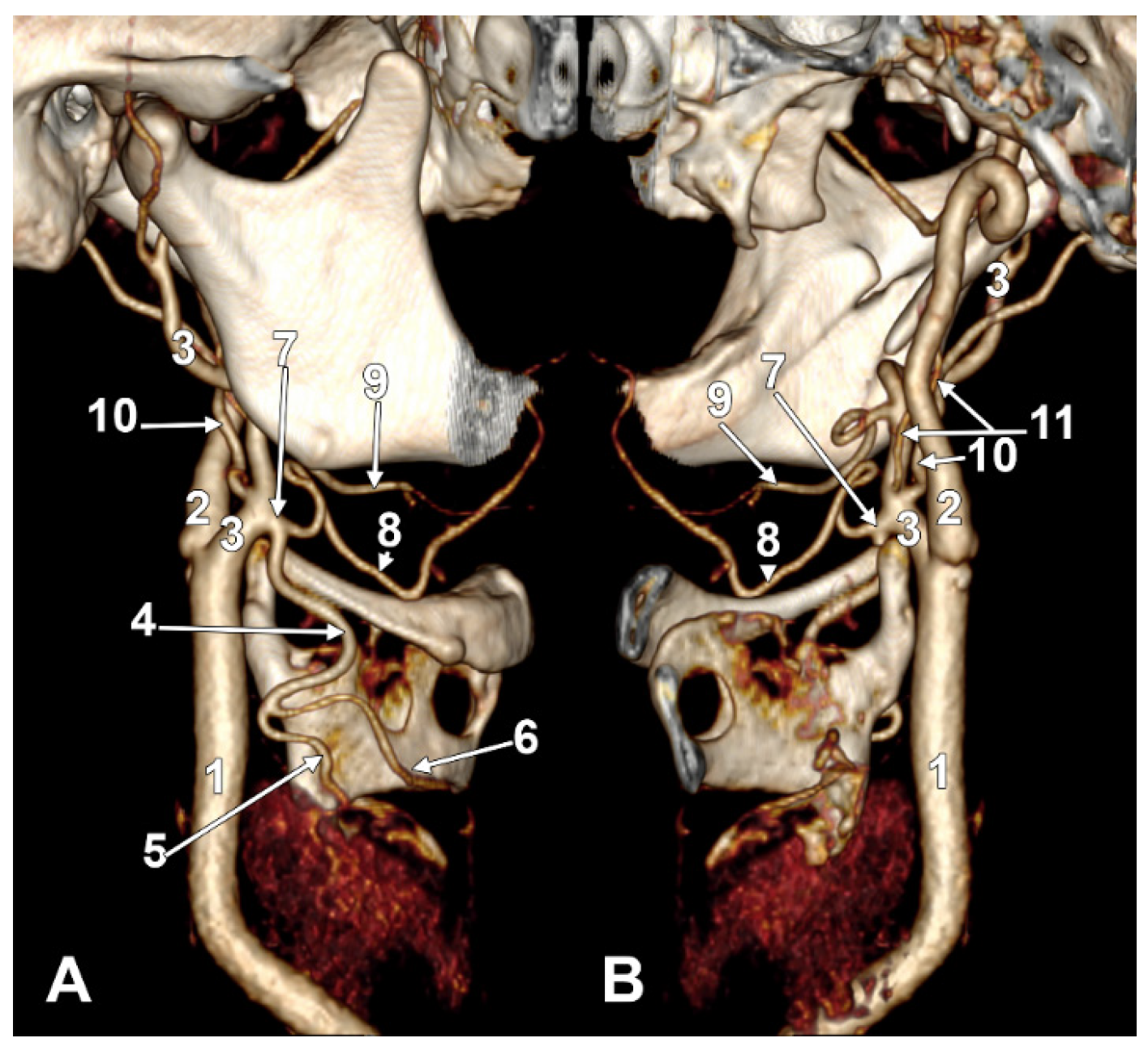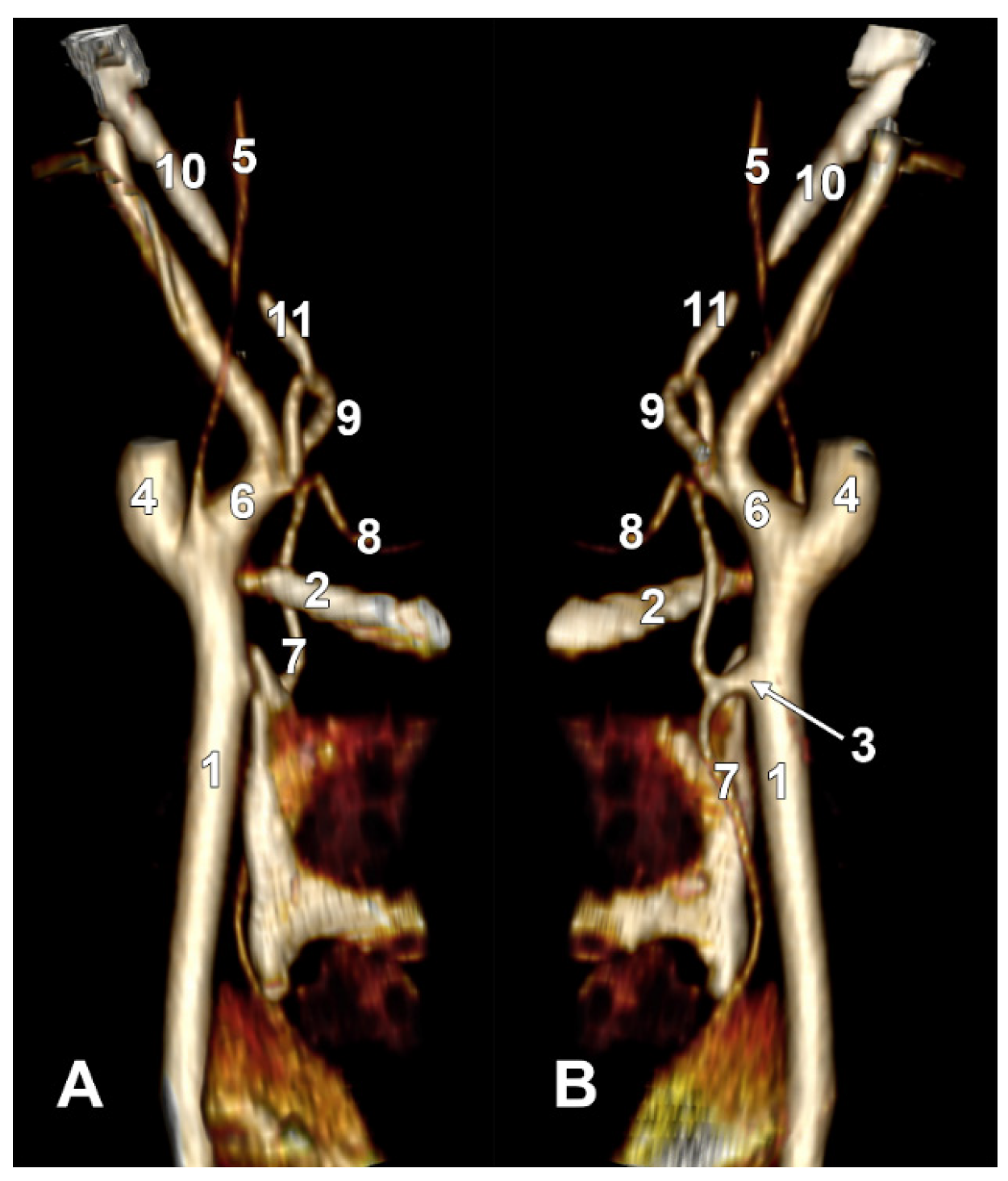 B) Medial view. 1. Common carotid artery; 2. internal carotid artery; 3. external carotid artery; 4. superior thyroid artery; 5. right thyroid branch; 6. left thyroid branch; 7. thyrolingual trunk; 8. lingual artery; 9. facial artery; 10. occipital artery; 11. ascending pharyngeal artery.