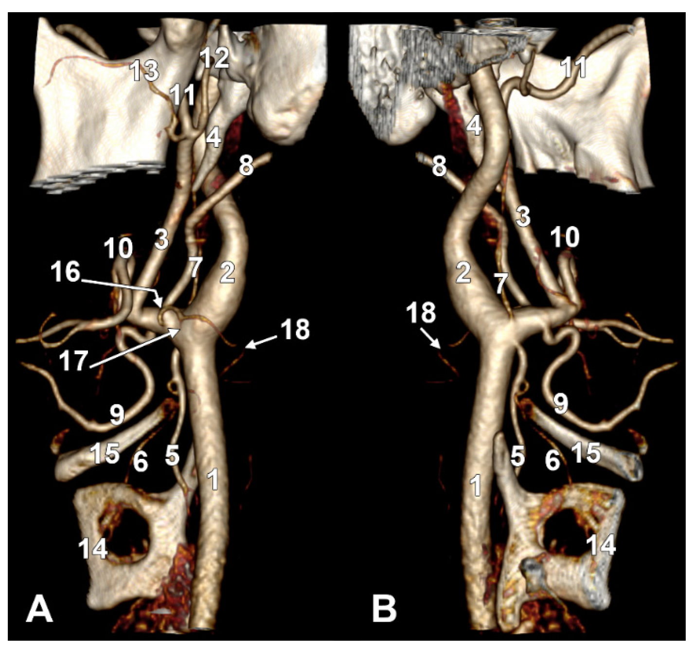 Type V ascending pharyngeal artery originating from the carotid bifurcation. Superior laryngeal artery with suprahyoid origin. Three-dimensional rendering. Left side. (A) Lateral view. (B) Medial view. 1. Common carotid artery; 2. internal carotid artery; 3. external carotid artery; 4. styloid process; 5. superior thyroid artery; 6. superior laryngeal artery; 7. ascending pharyngeal artery; 8. occipital artery; 9. lingual artery; 10. facial artery; 11. maxillary artery; 12. superficial temporal artery; 13. transverse facial artery; 14. thyroid cartilage; 15. greater hyoid horn; 16. sternocleidomastoid branch; 17. descending branch; 18. posterior branch.