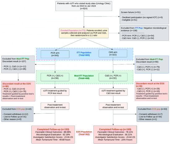 - Descriptive and per-symptom analyses (symptoms resolution): the end-of-study (EOS) population, including all participants with completed clinical follow-up (28 days) and paired PCR+ culture results (N = 362; PCR arm n = 193, C&S arm n = 169). Discordant EOS specimens (PCR+/C− and PCR−/C+) were analyzed as a nested subgroup (N = 116; PCR+/C− = 102; PCR−/C+ = 14).