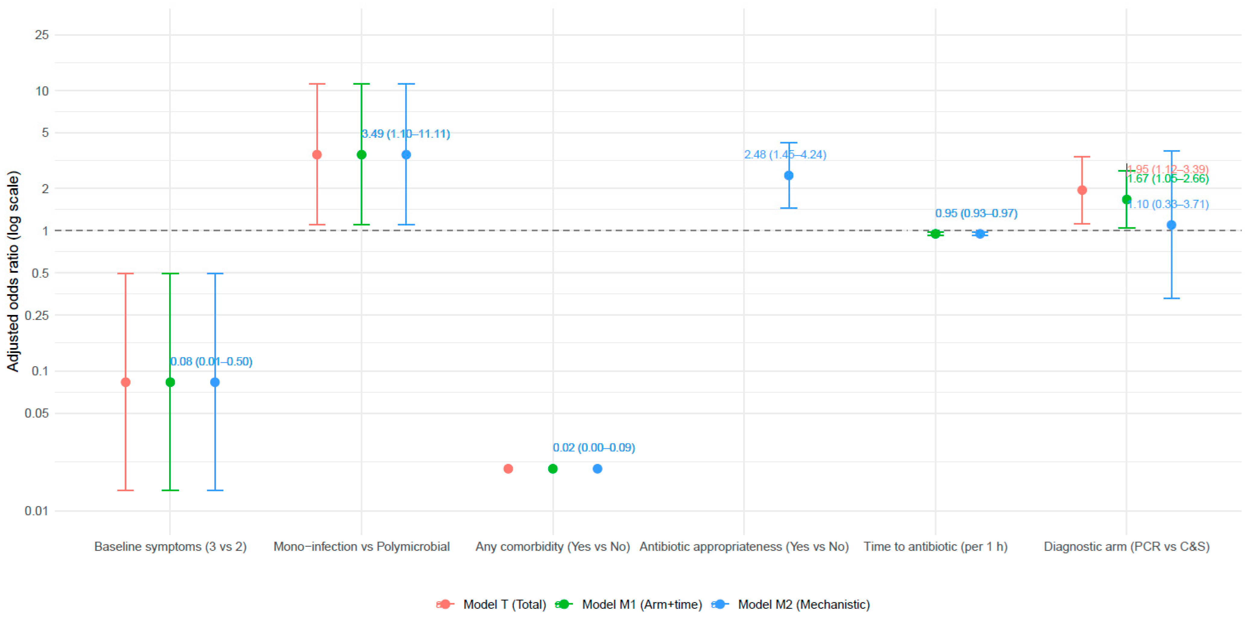 | Diagnostic arm—PCR vs. C&S (C&S = ref) | 1.95 (1.12–3.39) | 0.018 | 1.67 (1.05–2.66) | 0.032 | 1.10 (0.33–3.71) | 0.880 |