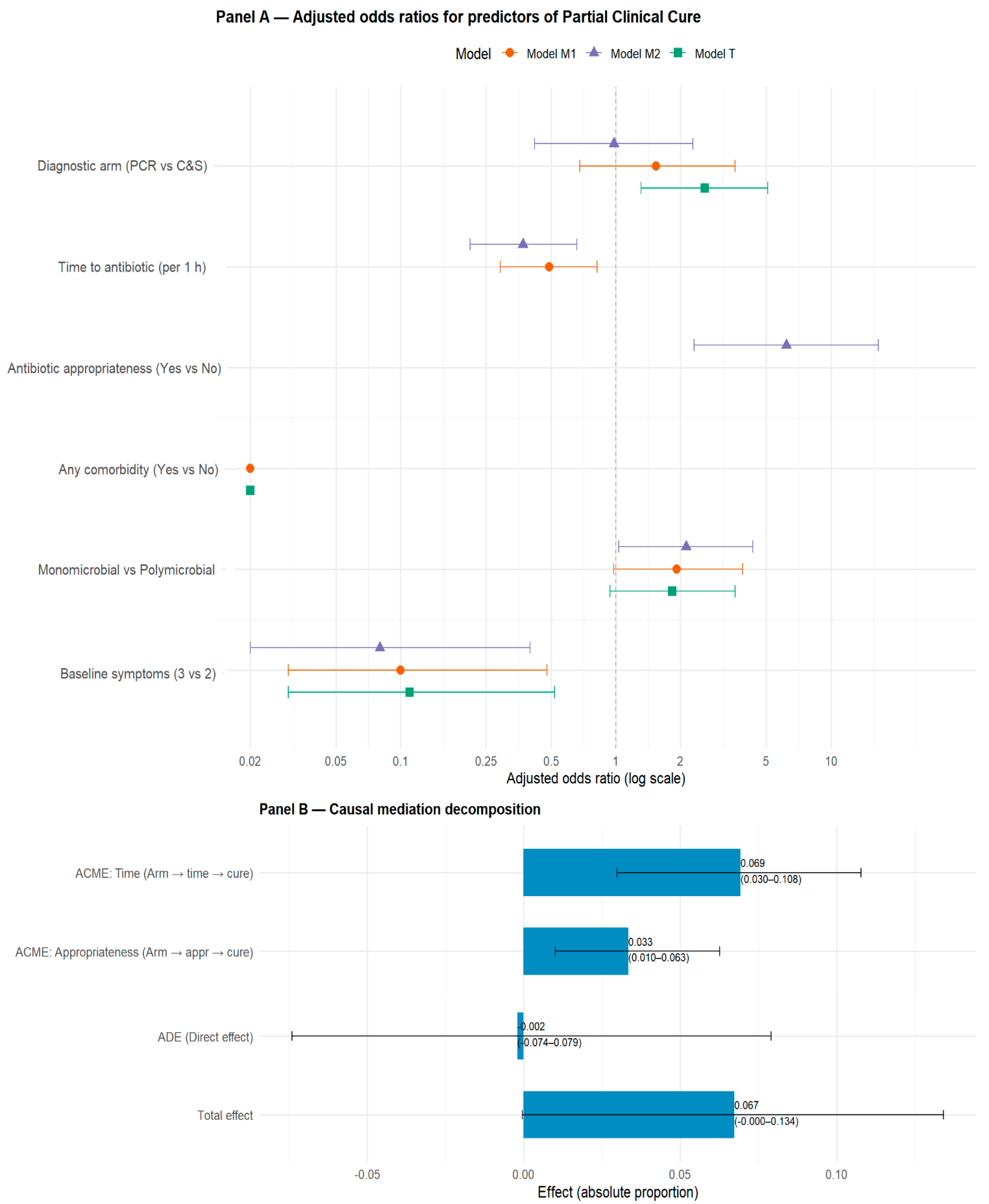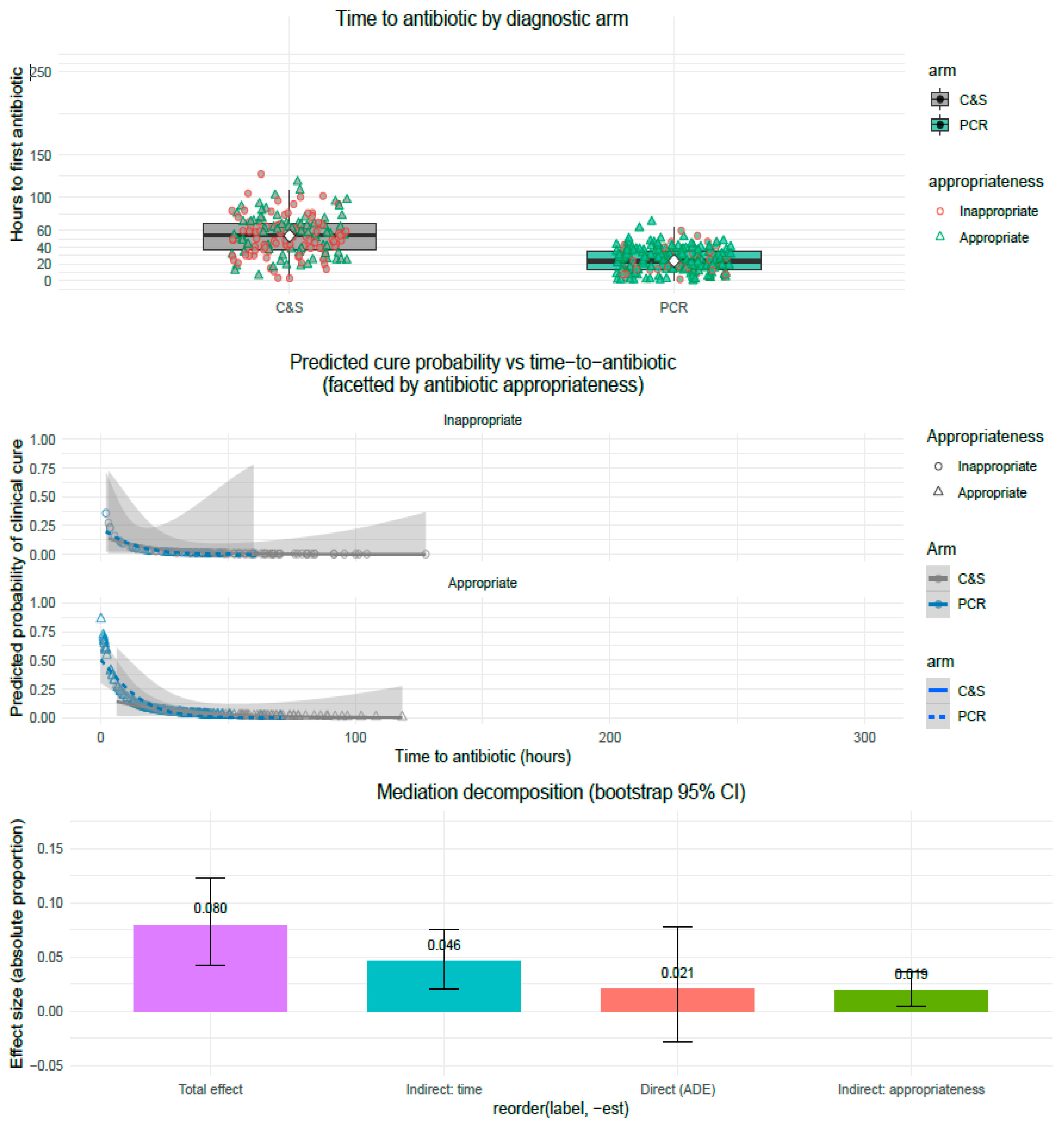 - Sequential mediation (time upstream of appropriateness): appropriate when earlier availability of results plausibly increases the probability of prescribing an appropriate antibiotic (Arm → time → appropriateness → cure). In this specification we model appropriateness as potentially dependent on log_time.