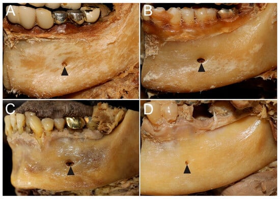 - Amorim, M.M.; Prado, F.B.; Borini, C.B.; Bittar, T.O.; Volpato, M.C.; Groppo, F.C.; Caria, P.H.F. The mental foramen in dentate and edentulous Brazilian mandibles. Int. J. Morphol. 2008, 26, 981–987. [Google Scholar] [CrossRef]