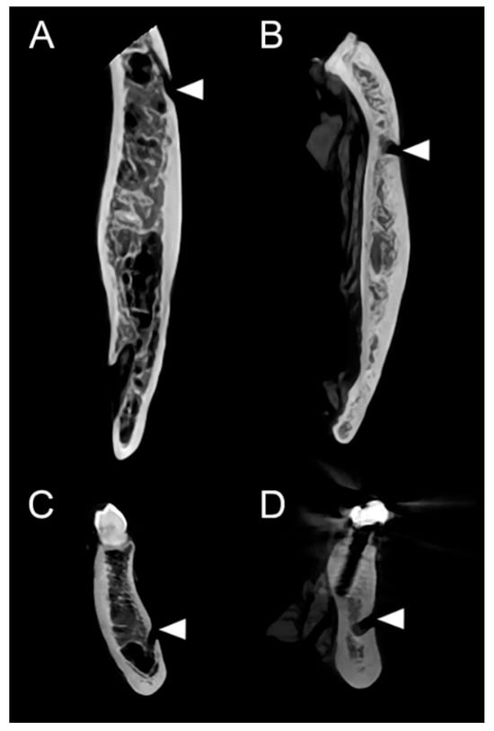 CBCT-based analysis of the opening direction of the mental canal. (A,C) Axial (A) and coronal (C) images demonstrating the posterolateral opening type, with the mental canal coursing posterolaterally toward the mental foramen (MF). (B,D) Axial (B) and coronal (D) images demonstrating the lateral opening type, in which the mental canal courses almost laterally before exiting through the MF. Arrowheads indicate the opening of the mental canal.
