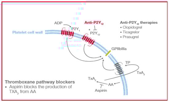 Platelet AA and ADP-activated receptors blocked by antiplatelet therapies. AA, arachidonic acid; ADP, adenosine diphosphate; GPIIbIIIa, glycoprotein Iib/IIIa; P2Y12, purinergic G protein-coupled receptor; TP, human TXA2 receptor; and TXA2, Thromboxane A2.