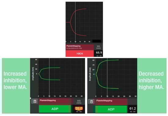 Use of TEG® PlateletMapping® testing: (upper panel) assessing the patient’s underlying, uninhibited clot strength (HKH-MA) and (lower panels) measuring platelet receptor function stimulated by ADP agonists (ADP MA). ADP, adenosine diphosphate; HKH, kaolin with heparinase; and MA, maximum amplitude.